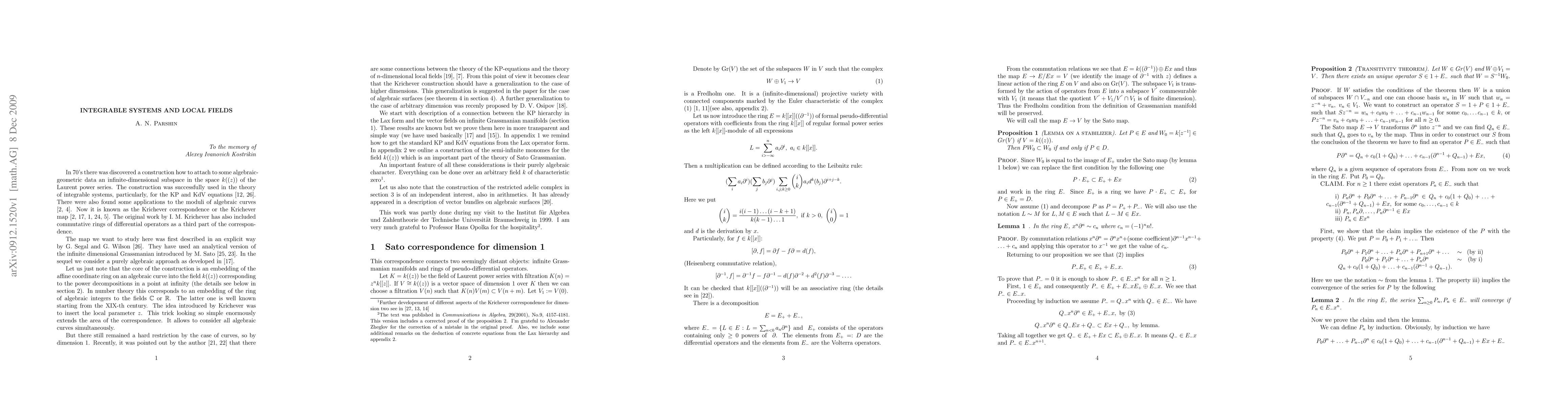 In 70's there was discovered a construction how to attach to some algebraic-geometric data an infinite-dimensional subspace in the space k((z)) of the Laurent power series. The construction is known as the Krichever correspondence. It was applied in the theory of integrable systems, particularly, for the KP and KdV equations. We show that the Krichever construction can be generalized to the case of dimension 2. We also include a known description of connection between the KP hierarchy in the Lax form and the vector fields on infinite Grassmanian manifolds and a construction of the semi-infinite monomes for the field k((z)) which is an important part of the theory of Sato Grassmanian. The text was published in Communications in Algebra, 29(2001), No.9, 4157-4181. This version includes a corrected proof of the proposition 2. Also, we include some additional remarks on the deduction of concrete equations from the Lax hierarchy and appendix 2.