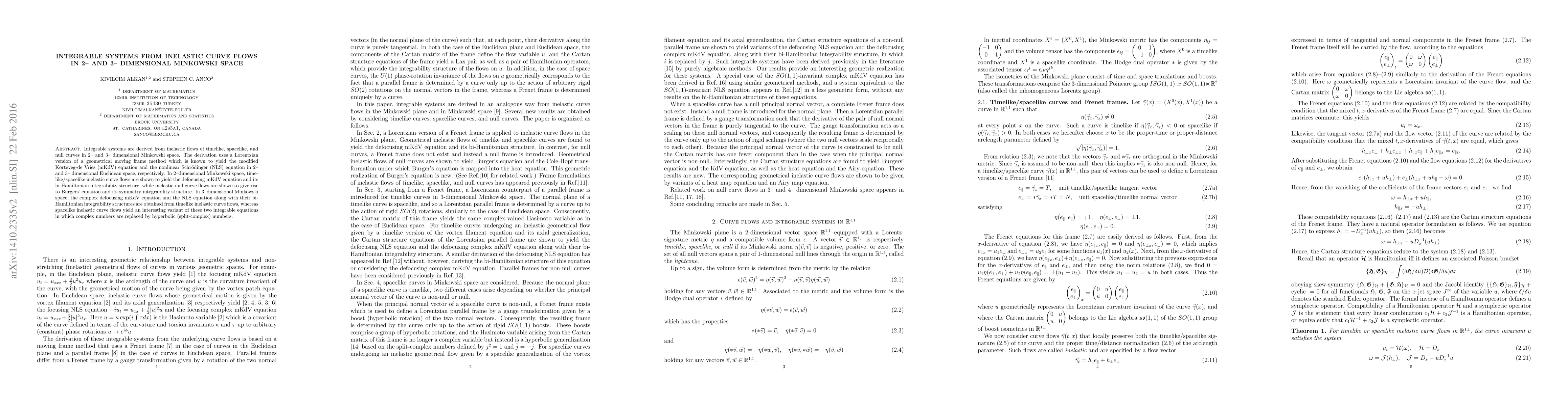 Integrable systems are derived from inelastic flows of timelike, spacelike, and null curves in 2- and 3- dimensional Minkowski space. The derivation uses a Lorentzian version of a geometrical moving frame method which is known to yield the modified Korteveg-de Vries (mKdV) equation and the nonlinear Schrodinger (NLS) equation in 2- and 3- dimensional Euclidean space, respectively. In 2-dimensional Minkowski space, timelike/spacelike inelastic curve flows are shown to yield the defocusing mKdV equation and its bi-Hamiltonian integrability structure, while inelastic null curve flows are shown to give rise to Burgers' equation and its symmetry integrability structure. In 3-dimensional Minkowski space, the complex defocusing mKdV equation and the NLS equation along with their bi-Hamiltonian integrability structures are obtained from timelike inelastic curve flows, whereas spacelike inelastic curve flows yield an interesting variant of these two integrable equations in which complex numbers are replaced by hyperbolic (split-complex) numbers.