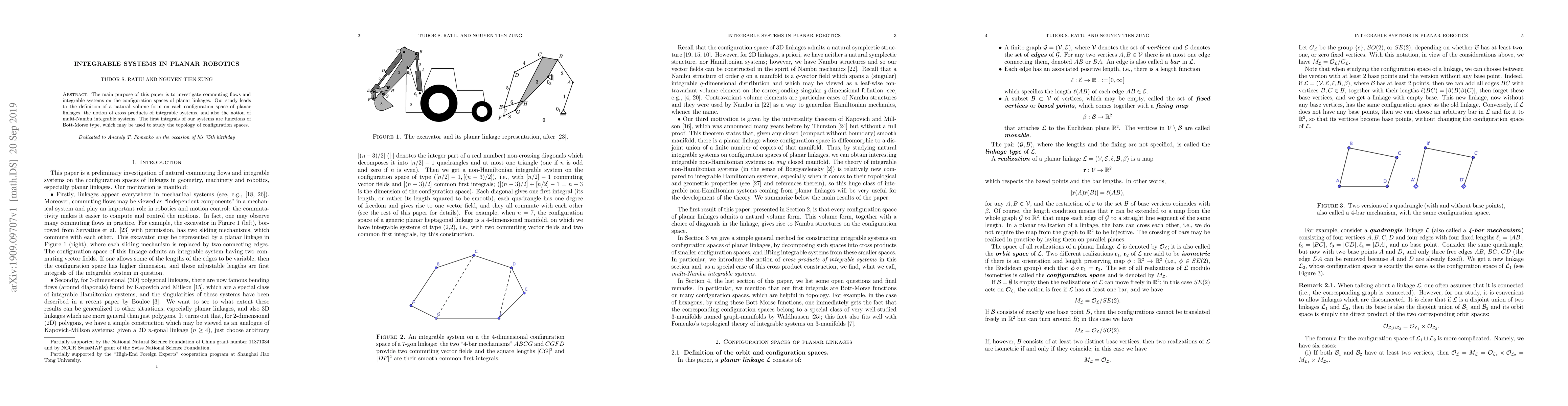 The paper investigates commuting flows and integrable systems on the configuration spaces of planar linkages, defining a natural volume form on each configuration space, introducing the notion of cross products of integrable systems, and multi-Nambu integrable systems. It proves the existence of first integrals of Bott-Morse type for these systems.