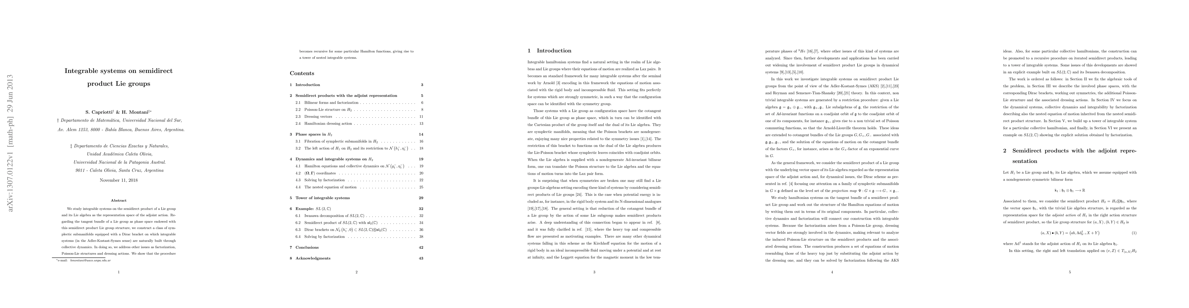 This paper explores integrable systems on semidirect product Lie groups, constructing symplectic submanifolds with a Dirac bracket for collective dynamics. It addresses factorization, Poisson-Lie structures, and dressing actions, revealing a recursive procedure for certain Hamilton functions that generates a hierarchy of nested integrable systems.