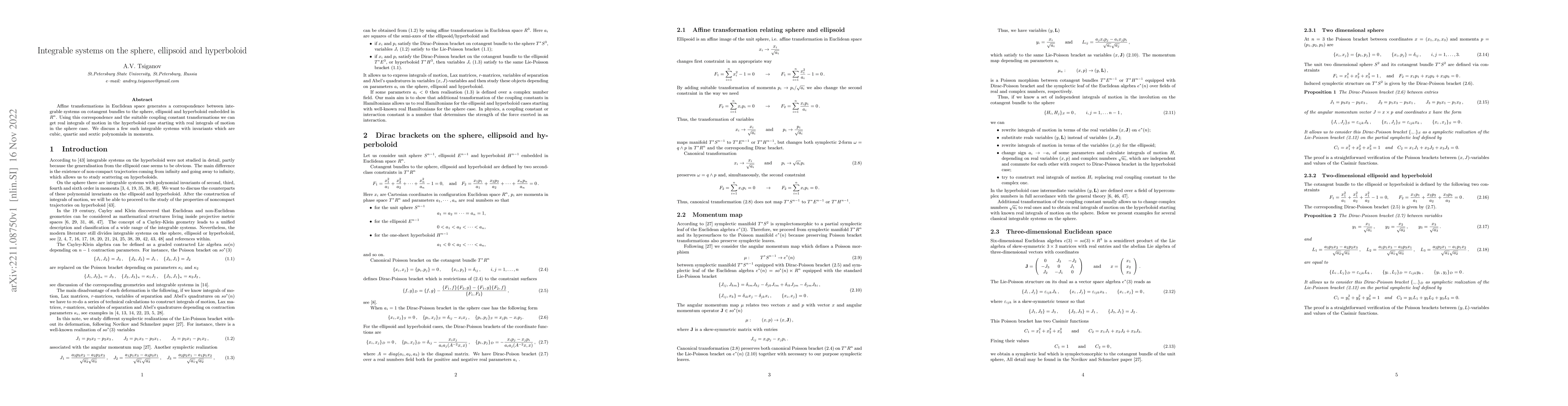This paper explores integrable systems on the sphere, ellipsoid, and hyperboloid through affine transformations in Euclidean space, establishing a correspondence that allows the derivation of real integrals of motion for hyperboloids from those on spheres. It examines specific integrable systems with cubic, quartic, and sextic polynomial invariants.
