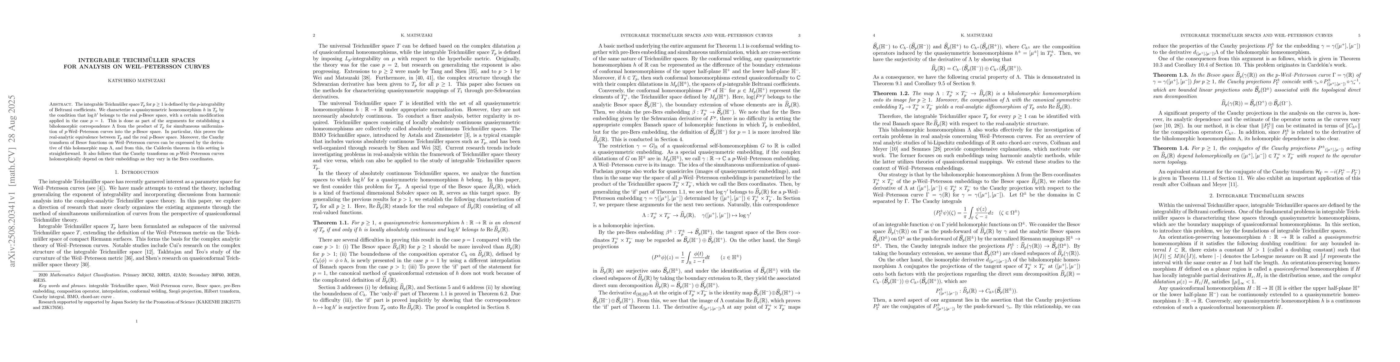The integrableTeichm\"uller space $T_p$ for $p \geq 1$ is defined by the $p$-integrability of Beltrami coefficients. We characterize a quasisymmetric homeomorphism $h$ in $T_p$ by the condition that $\log h'$ belongs to the real $p$-Besov space, with a certain modification applied in the case $p=1$. This is done as part of the arguments for establishing a biholomorphic correspondence $\Lambda$ from the product of $T_p$ for simultaneous uniformization of $p$-Weil-Petersson curves into the $p$-Besov space. In particular, this proves the real-analytic equivalence between $T_p$ and the real $p$-Besov space. Moreover, the Cauchy transform of Besov functions on Weil-Petersson curves can be expressed by the derivative of this holomorphic map $\Lambda$, and from this, the Calder\'on theorem in this setting is straightforward. It also follows that the Cauchy transforms on $p$-Weil-Petersson curves holomorphically depend on their embeddings as they vary in the Bers coordinates.