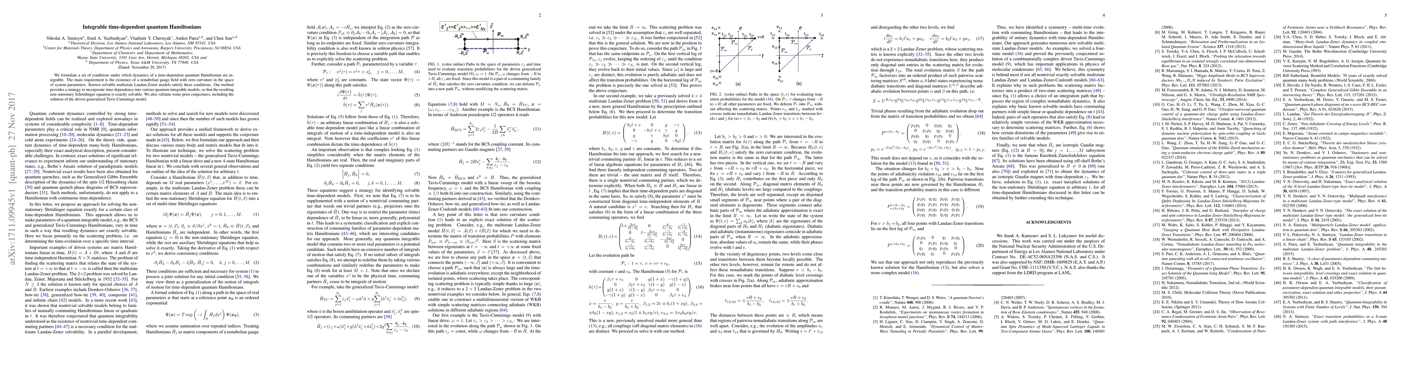 We formulate a set of conditions under which dynamics of a time-dependent quantum Hamiltonian are integrable. The main requirement is the existence of a nonabelian gauge field with zero curvature in the space of system parameters. Known solvable multistate Landau-Zener models satisfy these conditions. Our method provides a strategy to incorporate time-dependence into various quantum integrable models, so that the resulting non-stationary Schrodinger equation is exactly solvable. We also validate some prior conjectures, including the solution of the driven generalized Tavis-Cummings model.