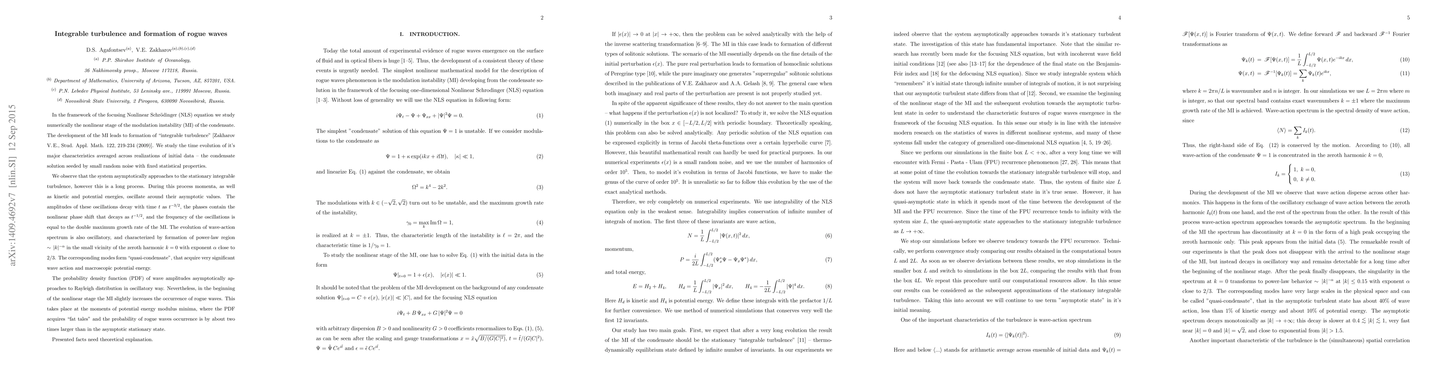 This paper numerically investigates the nonlinear modulation instability in the focusing Nonlinear Schrödinger equation, leading to "integrable turbulence." It examines the time evolution of averaged characteristics, including the wave-action spectrum, spatial correlation function, probability density function of wave amplitudes, and energy distributions.