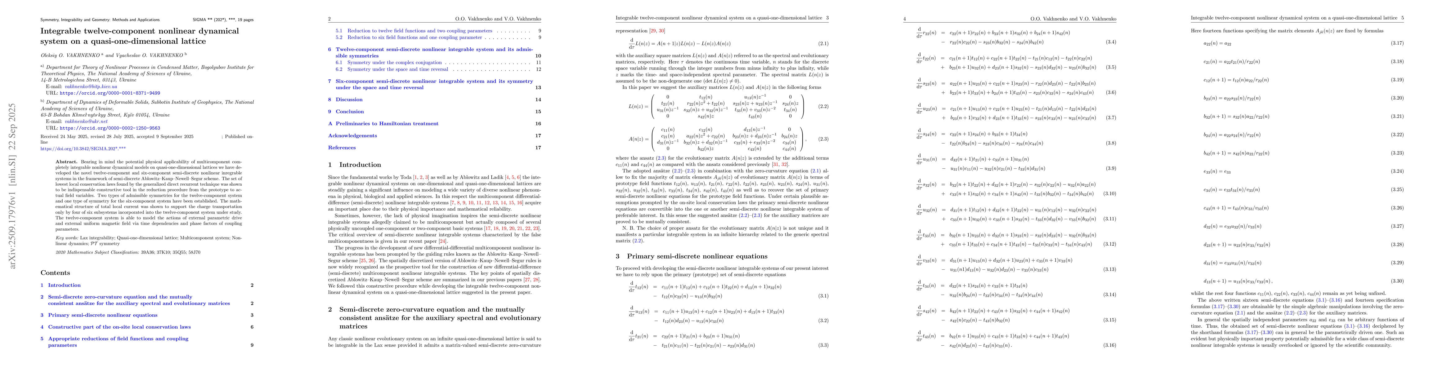 Bearing in mind the potential physical applicability of multicomponent completely integrable nonlinear dynamical models on quasi-one-dimensional lattices we have developed the novel twelve-component and six-component semi-discrete nonlinear inregrable systems in the framework of semi-discrete Ablowitz--Kaup--Newell--Segur scheme. The set of lowest local conservation laws found by the generalized direct recurrent technique was shown to be indispensable constructive tool in the reduction procedure from the prototype to actual field variables. Two types of admissible symmetries for the twelve-component system and one type of symmetry for the six-component system have been established. The mathematical structure of total local current was shown to support the charge transportation only by four of six subsystems incorporated into the twelve-component system under study. The twelve-component system is able to model the actions of external parametric drive and external uniform magnetic field via time dependencies and phase factors of coupling parameters.
