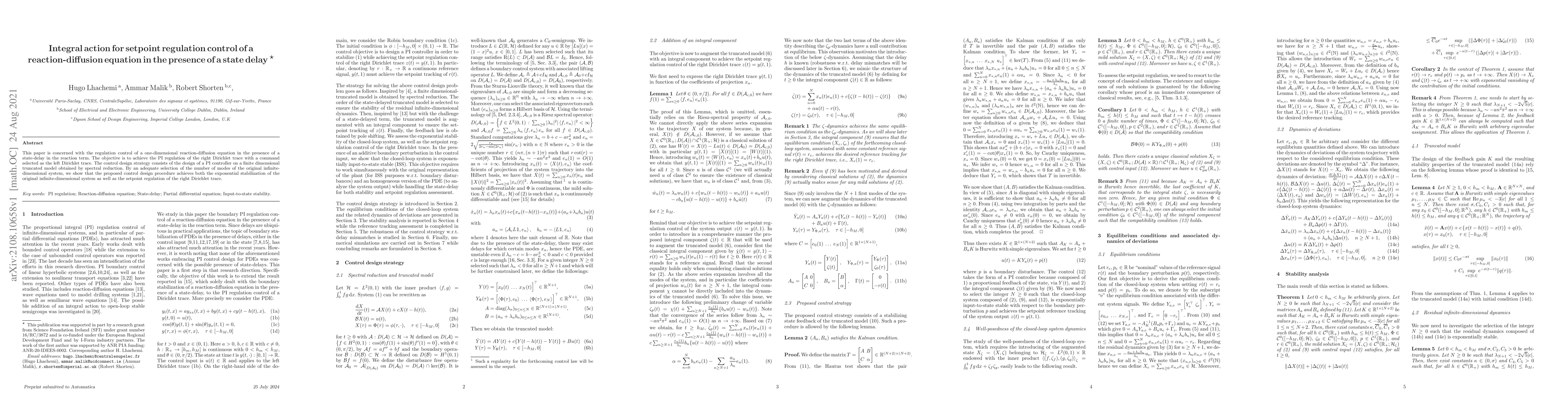 This paper is concerned with the regulation control of a one-dimensional reaction-diffusion equation in the presence of a state-delay in the reaction term. The objective is to achieve the PI regulation of the right Dirichlet trace with a command selected as the left Dirichlet trace. The control design strategy consists of the design of a PI controller on a finite dimensional truncated model obtained by spectral reduction. By an adequate selection of the number of modes of the original infinite-dimensional system, we show that the proposed control design procedure achieves both the exponential stabilization of the original infinite-dimensional system as well as the setpoint regulation of the right Dirichlet trace.
