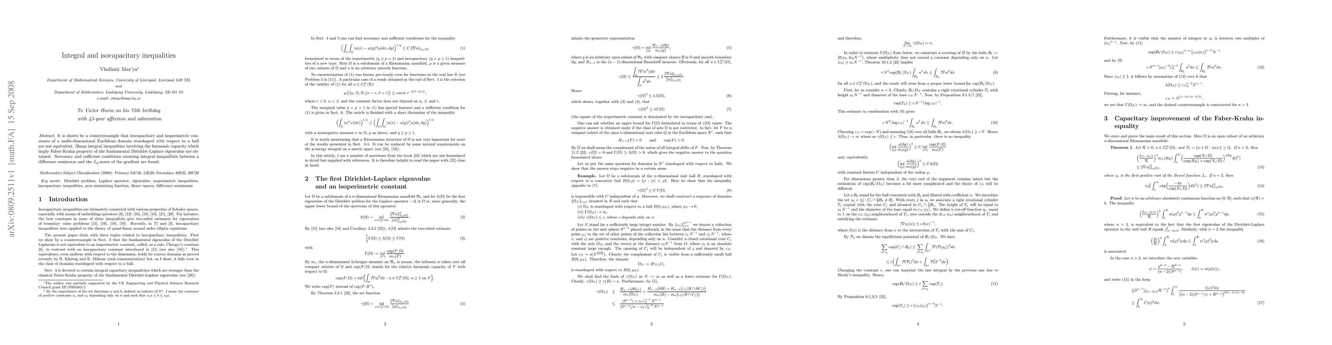 It is shown by a counterexample that isocapacitary and isoperimetric constants of a multi-dimensional Euclidean domain starshaped with respect to a ball are not equivalent. Sharp integral inequalities involving the harmonic capacity which imply Faber-Krahn property of the fundamental Dirichlet-Laplace eigenvalue are obtained. Necessary and sufficient conditions ensuring integral inequalities between a difference seminorm and the $L_p$-norm of the gradient are found.