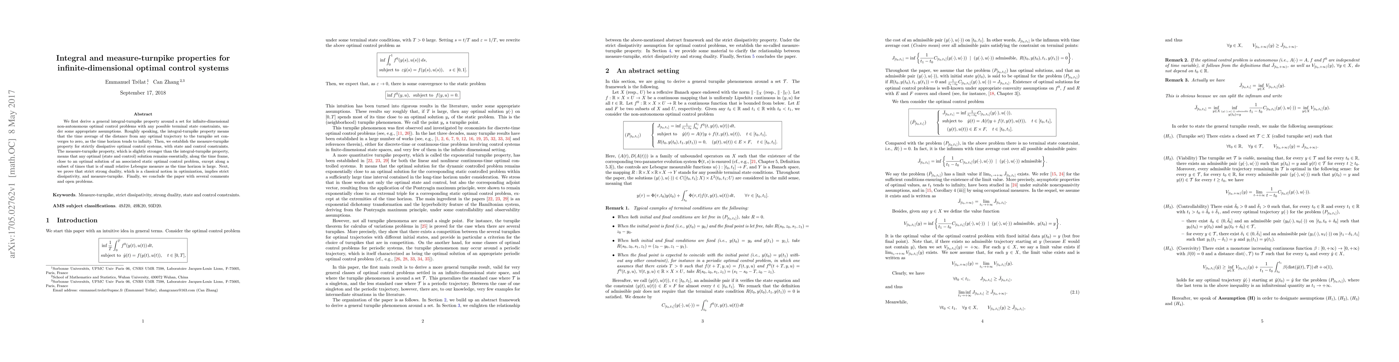 We first derive a general integral-turnpike property around a set for infinite-dimensional non-autonomous optimal control problems with any possible terminal state constraints, under some appropriate assumptions. Roughly speaking, the integral-turnpike property means that the time average of the distance from any optimal trajectory to the turnpike set con- verges to zero, as the time horizon tends to infinity. Then, we establish the measure-turnpike property for strictly dissipative optimal control systems, with state and control constraints. The measure-turnpike property, which is slightly stronger than the integral-turnpike property, means that any optimal (state and control) solution remains essentially, along the time frame, close to an optimal solution of an associated static optimal control problem, except along a subset of times that is of small relative Lebesgue measure as the time horizon is large. Next, we prove that strict strong duality, which is a classical notion in optimization, implies strict dissipativity, and measure-turnpike. Finally, we conclude the paper with several comments and open problems.