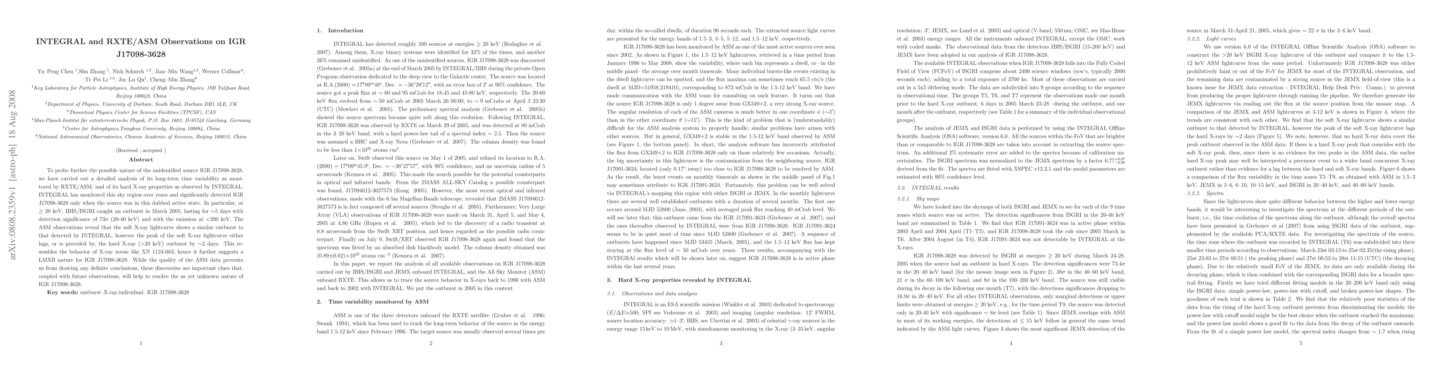 Researchers analyzed long-term variability of IGR J17098-3628 using RXTE/ASM and INTEGRAL data, finding a hard X-ray outburst with a soft X-ray counterpart that lags or precedes it by up to 2 days, suggesting a LMXB nature.