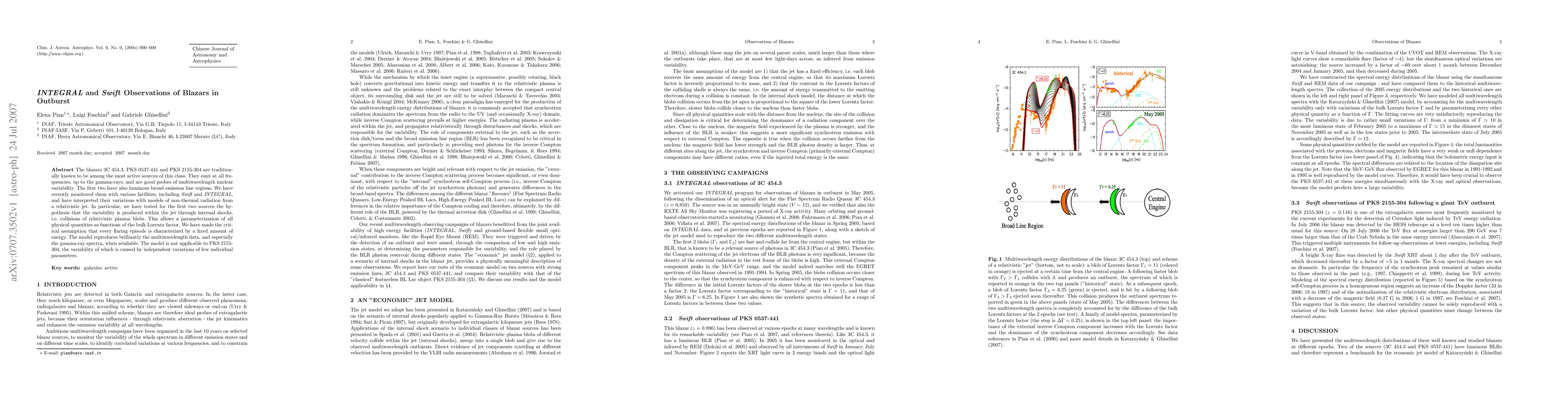 The blazars 3C 454.3, PKS 0537-441 and PKS 2155-304 are traditionally known to be among the most active sources of this class. They emit at all frequencies, up to the gamma-rays, and are good probes of multiwavelength nuclear variability. The first two have also luminous broad emission line regions. We have recently monitored them with various facilities, including Swift and INTEGRAL, and have interpreted their variations with models of non-thermal radiation from a relativistic jet. In particular, we have tested for the first two sources the hypothesis that the variability is produced within the jet through internal shocks, i.e. collisions of relativistic plasma blobs. This allows a parameterization of all physical quantities as functions of the bulk Lorentz factor. We have made the critical assumption that every flaring episode is characterized by a fixed amount of energy. The model reproduces brilliantly the multiwavelength data and especially the gamma-ray spectra, when available. The model is not applicable to PKS 2155-304, the variability of which is caused by independent variations of few individual parameters.