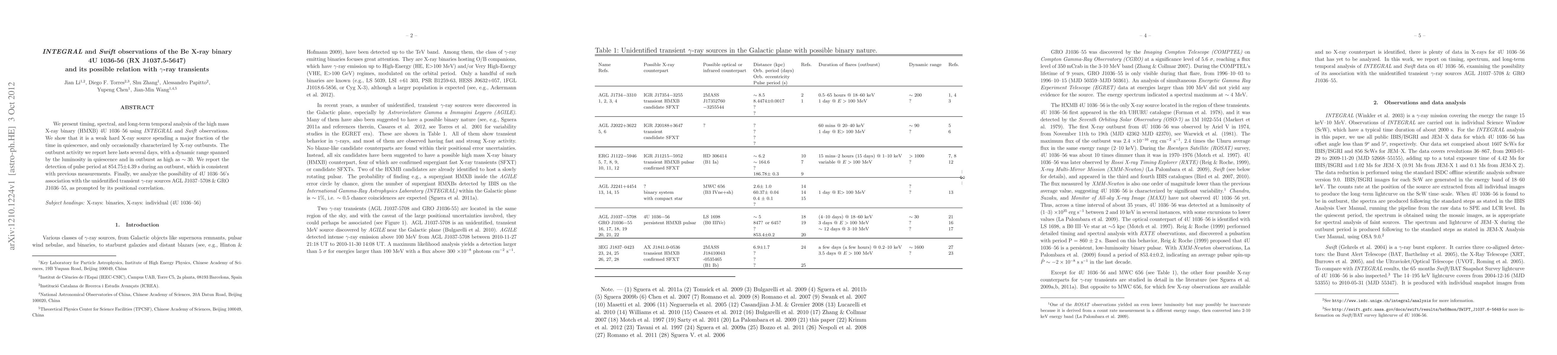 We present timing, spectral, and long-term temporal analysis of the high mass X-ray binary (HMXB) 4U 1036-56 using INTEGRAL and Swift observations. We show that it is a weak hard X-ray source spending a major fraction of the time in quiescence, and only occasionally characterized by X-ray outbursts. The outburst activity we report here lasts several days, with a dynamic range spanned by the luminosity in quiescence and in outburst as high as ~30. We report the detection of pulse period at 854.75+/-4.39 s during an outburst, which is consistent with previous measurements. Finally, we analyze the possibility of 4U 1036--56's association with the unidentified transient gamma-ray sources AGL J1037--5708 & GRO J1036--55, as prompted by its positional correlation.
