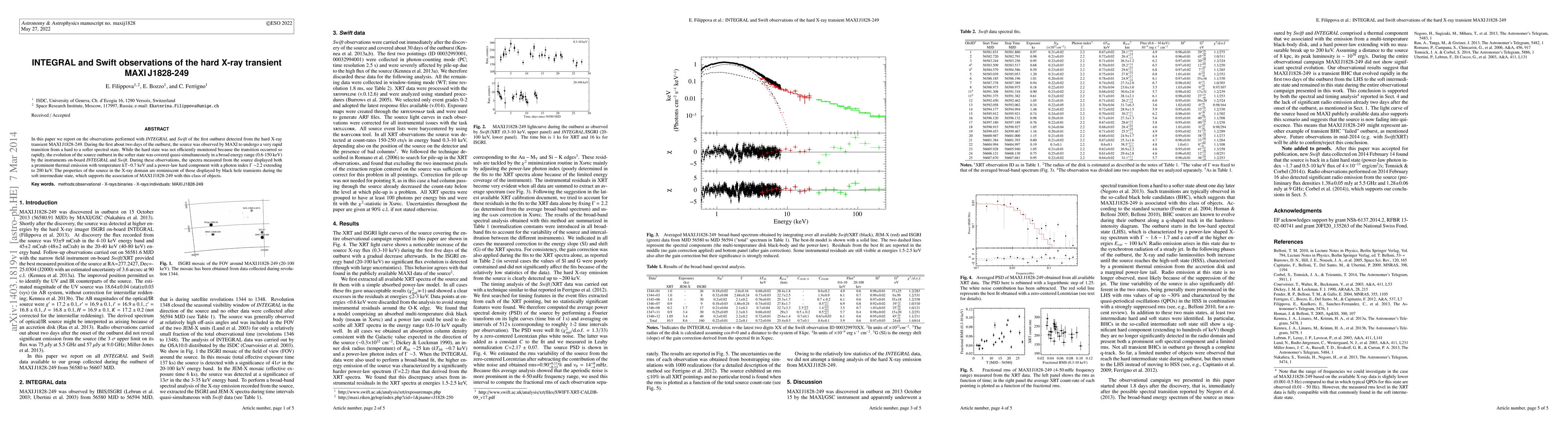 In this paper we report on the observations performed with INTEGRAL and Swift of the first outburst detected from the hard X-ray transient MAXI J1828-249. During the first about two days of the outburst, the source was observed by MAXI to undergo a very rapid transition from a hard to a softer spectral state. While the hard state was not efficiently monitored because the transition occurred so rapidly, the evolution of the source outburst in the softer state was covered quasi-simultaneously in a broad energy range (0.6-150 keV) by the instruments on-board INTEGRAL and Swift. During these observations, the spectra measured from the source displayed both a prominent thermal emission with temperature kT 0.7 keV and a power-law hard component with a photon index gamma 2.2 extending to 200 keV. The properties of the source in the X-ray domain are reminiscent of those displayed by black hole transients during the soft intermediate state, which supports the association of MAXI J1828-249 with this class of objects.