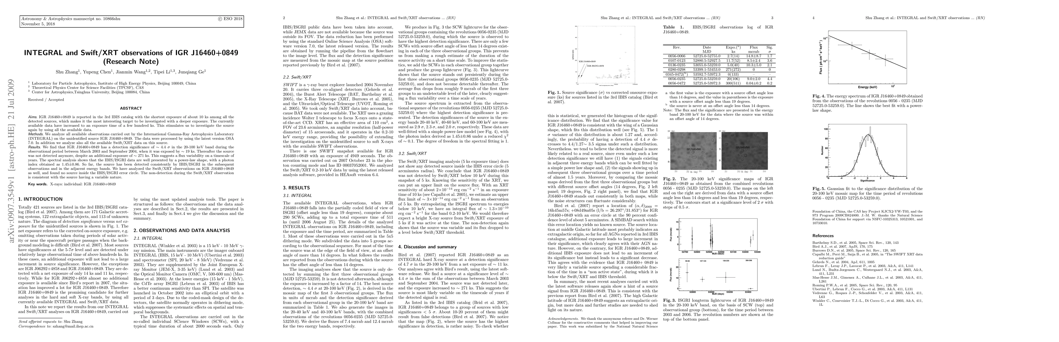 IGR J16460+0849 is reported in the 3rd IBIS catalog with the shortest exposure of about 10 ks among all the detected sources, which makes it the most interesting target to be investigated with a deeper exposure. We analyze all available observations carried out by the International Gamma-Ray Astrophysics Laboratory (INTEGRAL) on the unidentified source IGR J16460+0849. The data were processed by using the latest version OSA 7.0. In addition we analyze also all the available Swift/XRT data on this source. We find that IGR J16460+0849 has a detection significance of ~ 4.4 sigma in the 20-100 keV band during the observational period between March 2003 and September 2004, when it was exposed by ~ 19 ks. Thereafter the source was not detected anymore, despite an additional exposure of ~ 271 ks. This suggests a flux variability on a timescale of years. The spectral analysis shows that the IBIS/ISGRI data are well presented by a power-law shape, with a photon index obtained as 1.45+-0.86. So far, the source has been detected consistently by IBIS/ISGRI in the subsequent observations and in the adjacent energy bands. We have analyzed the Swift/XRT observations on IGR J16460+0849 as well, and found no source inside the IBIS/ISGRI error circle. The non-detection during the Swift/XRT observation is consistent with the source having a variable nature.
