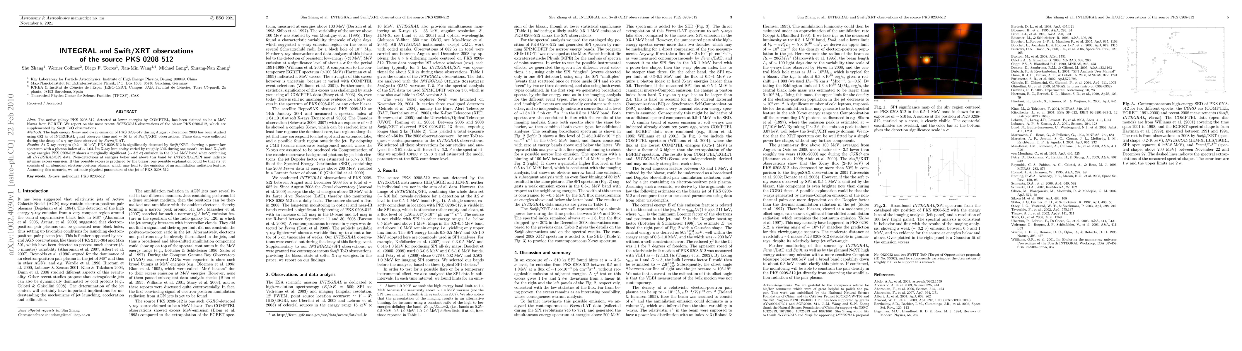 The active galaxy PKS 0208-512, detected at lower energies by COMPTEL, has been claimed to be a MeV blazar from EGRET. We report on the most recent INTEGRAL observations of the blazar PKS 0208-512, which are supplemented by Swift ToO observations. The high energy X-ray and gamma-ray emission of PKS 0208-512 during August - December 2008 has been studied using 682 ks of INTEGRAL guest observer time and ~ 56 ks of Swift/XRT observations. These data were collected during the decay of a gamma-ray flare observed by Fermi/LAT. At X-ray energies (0.2 - 10 keV) PKS 0208-512 is significantly detected by Swift/XRT, showing a power-law spectrum with a photon index of ~ 1.64. Its X-ray luminosity varied by roughly 30% during one month. At hard X-/soft gamma-ray energies PKS 0208-512 shows a marginally significant (~ 3.2 sigma) emission in the 0.5-1 MeV band when combining all INTEGRAL/SPI data. Non-detections at energies below and above this band by INTEGRAL/SPI may indicate intrinsic excess emission. If this possible excess is produced by the blazar, one possible explanation could be that its jet consists of an abundant electron-positron plasma, which may lead to the emission of an annihilation radiation feature. Assuming this scenario, we estimate physical parameters of the jet of PKS 0208-512.