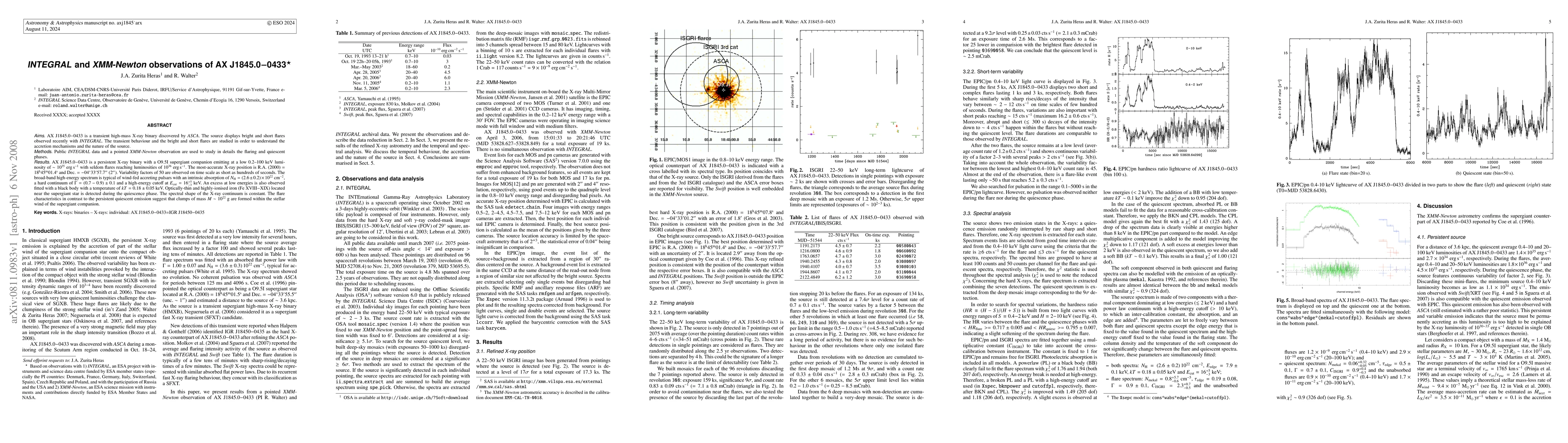 The study of AX J1845.0-0433 reveals a wind-fed accreting pulsar with massive flares that form clumps of mass in the supergiant's stellar wind, and a quiescent emission spectrum dominated by iron emissions.