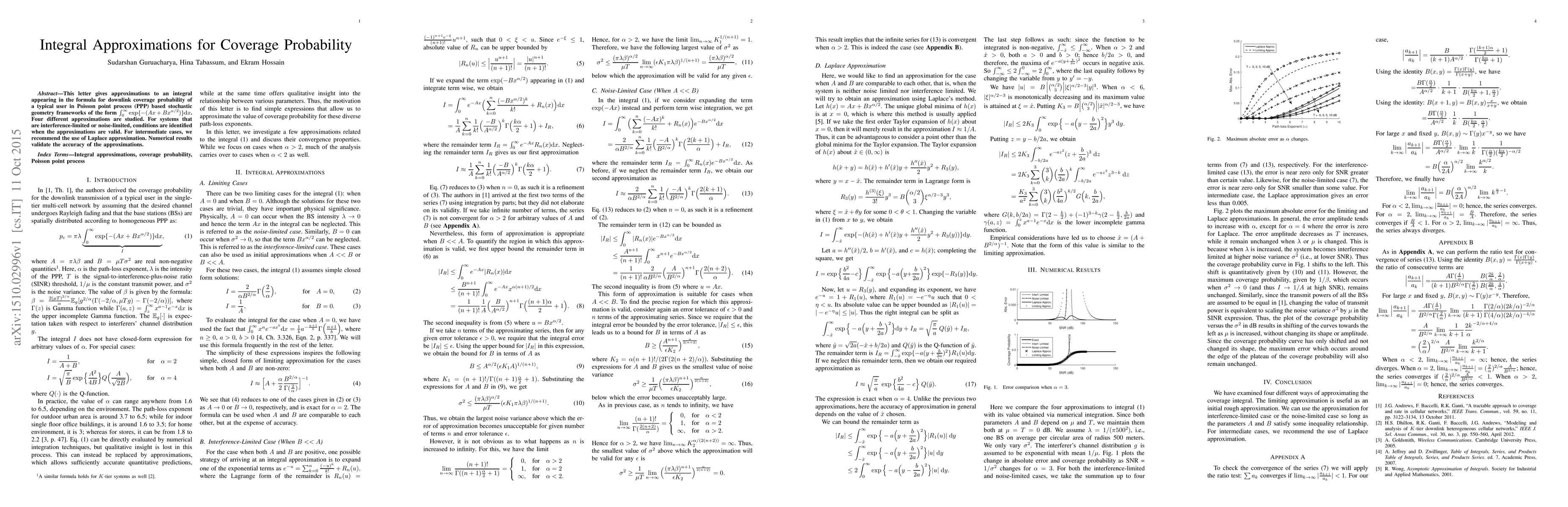 This letter gives approximations to an integral appearing in the formula for downlink coverage probability of a typical user in Poisson point process (PPP) based stochastic geometry frameworks of the form $\int_0^\infty \exp\{ - (Ax + B x^{\alpha/2}) \} \ud x$. Four different approximations are studied. For systems that are interference-limited or noise-limited, conditions are identified when the approximations are valid. For intermediate cases, we recommend the use of Laplace approximation. Numerical results validate the accuracy of the approximations.
