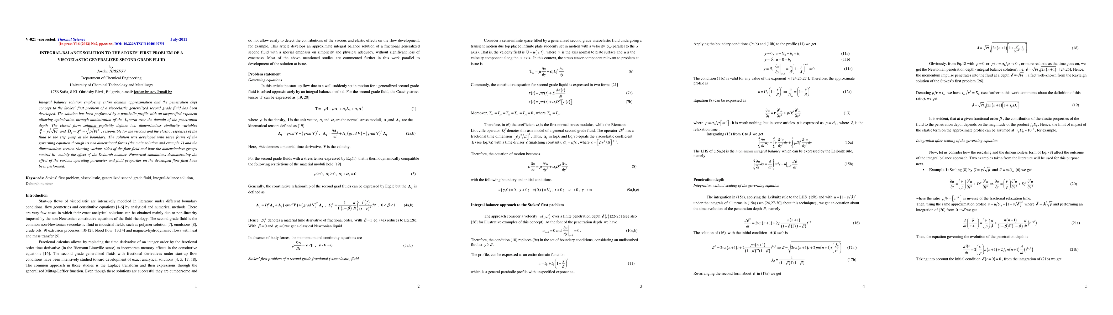 Integral balance solution employing entire domain approximation and the penetration dept concept to the Stokes' first problem of a viscoelastic generalized second grade fluid has been developed. The solution has been performed by a parabolic profile with an unspecified exponent allowing optimization through minimization of the norm over the domain of the penetration depth. The closed form solution explicitly defines two dimensionless similarity variables and, responsible for the viscous and the elastic responses of the fluid to the step jump at the boundary. The solution was developed with three forms of the governing equation through its two dimensional forms (the main solution and example 1) and the dimensionless version showing various sides of the flow field and how the dimensionless groups control it: mainly the effect of the Deborah number. Numerical simulations demonstrating the effect of the various operating parameter and fluid properties on the developed flow filed have been performed.
