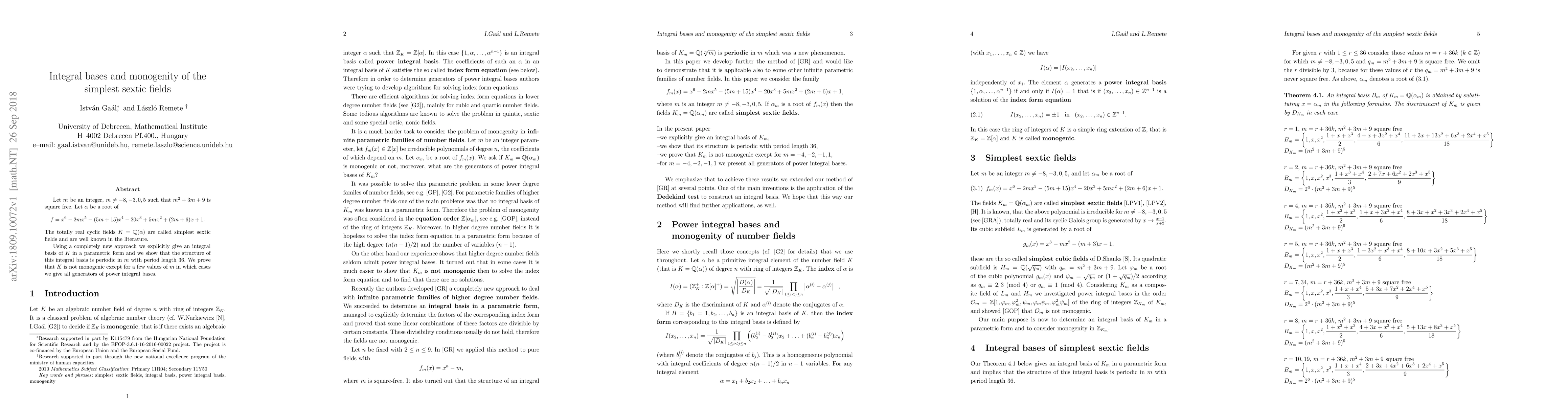 Summary: The paper presents a new approach to derive an integral basis for simplest sextic fields $K=\mathbb{Q}(\alpha)$, where $\alpha$ is a root of a specific sextic polynomial. It shows that the integral basis structure is periodic with period 36 and proves that $K$ is generally non-monogenic, with exceptions for specific values of $m$ where generators of power integral bases are provided.