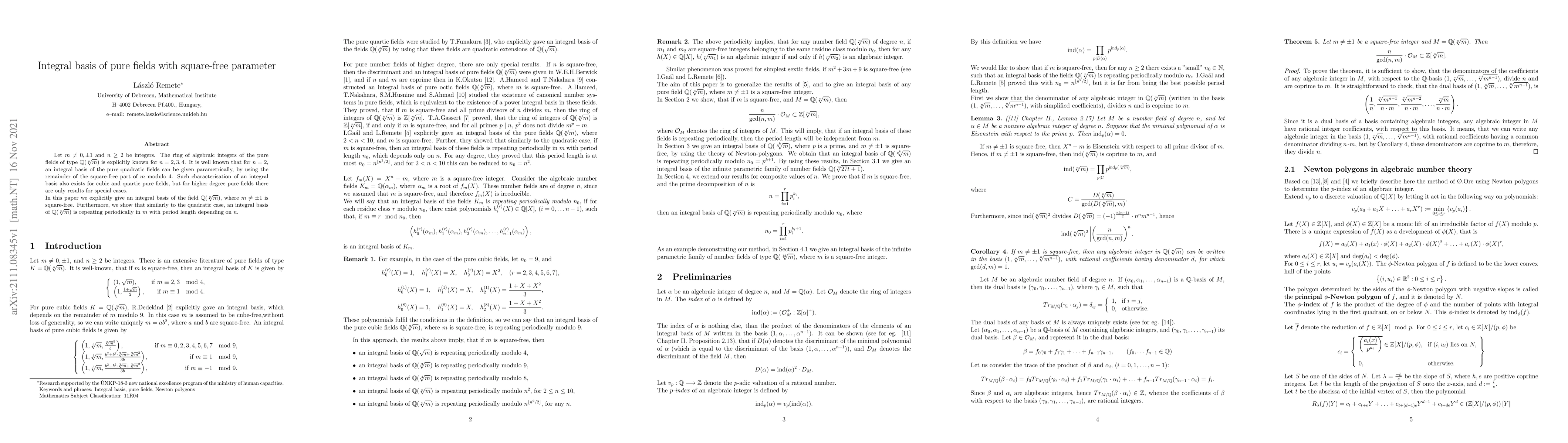 Researchers have found an explicit integral basis for pure fields of type $ ext{Q}( ext{√}[n]{m})$, where $m$ is square-free and $n ext{geq } 2$. The basis depends on the period length, which varies with $n$.