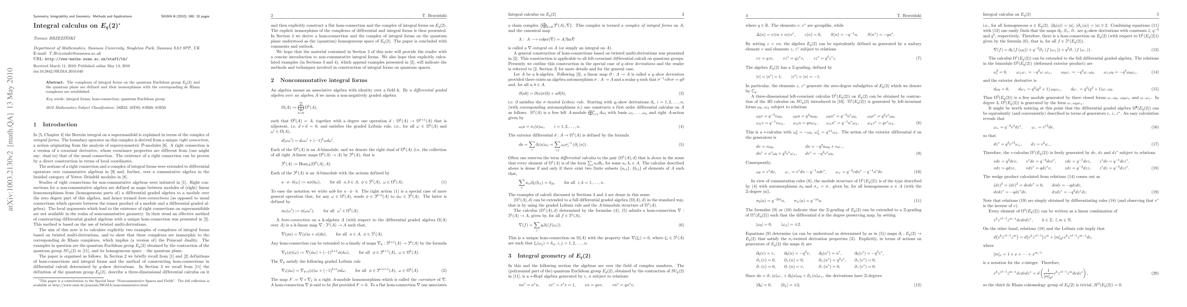 Summary: This paper defines integral forms on the quantum Euclidean group $E_q(2)$ and the quantum plane, and establishes their isomorphisms with the corresponding de Rham complexes, exploring the structure of integral calculus in a quantum context.