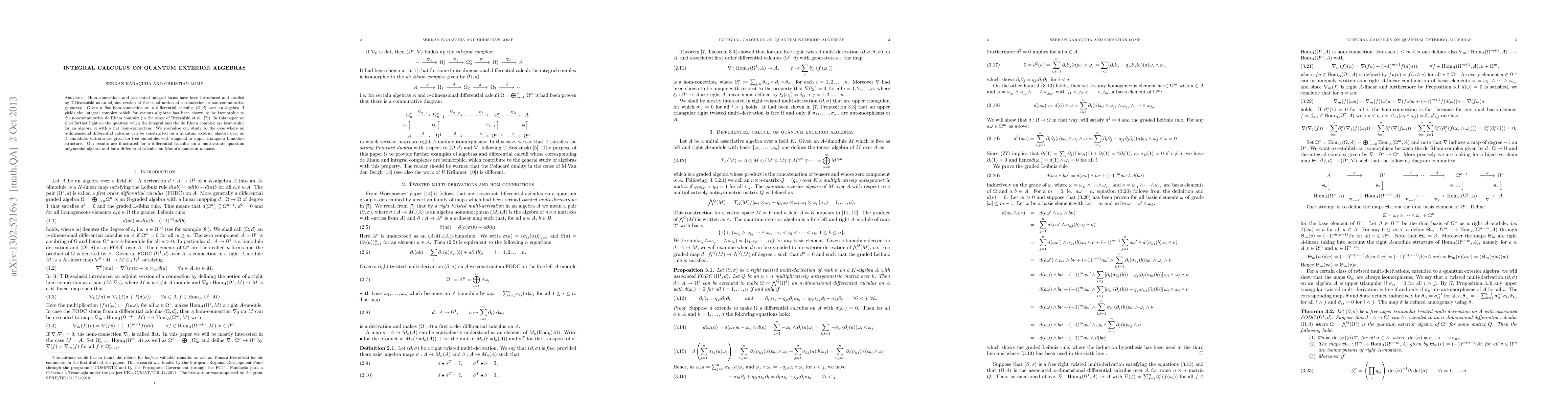 This paper explores the isomorphism between the integral complex derived from a flat hom-connection on a differential calculus over an algebra and the noncommutative de Rham complex. It provides criteria for the isomorphism in the context of quantum exterior algebras, specifically for free bimodules with diagonal or upper triangular structures, and illustrates the results with examples from quantum polynomial algebra and Manin's quantum n-space.