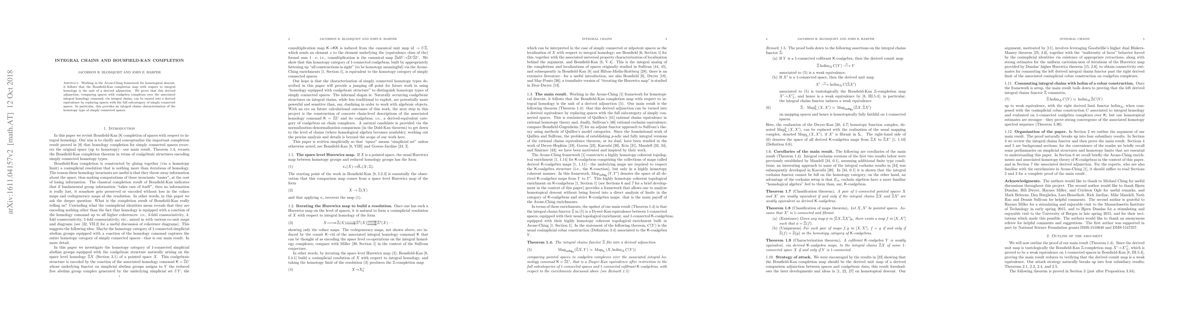 Working in the Arone-Ching framework for homotopical descent, it follows that the Bousfield-Kan completion map with respect to integral homology is the unit of a derived adjunction. We prove that this derived adjunction, comparing spaces with coalgebra complexes over the associated integral homology comonad, via integral chains, can be turned into a derived equivalence by replacing spaces with the full subcategory of simply connected spaces. In particular, this provides an integral chains characterization of the homotopy type of simply connected spaces.