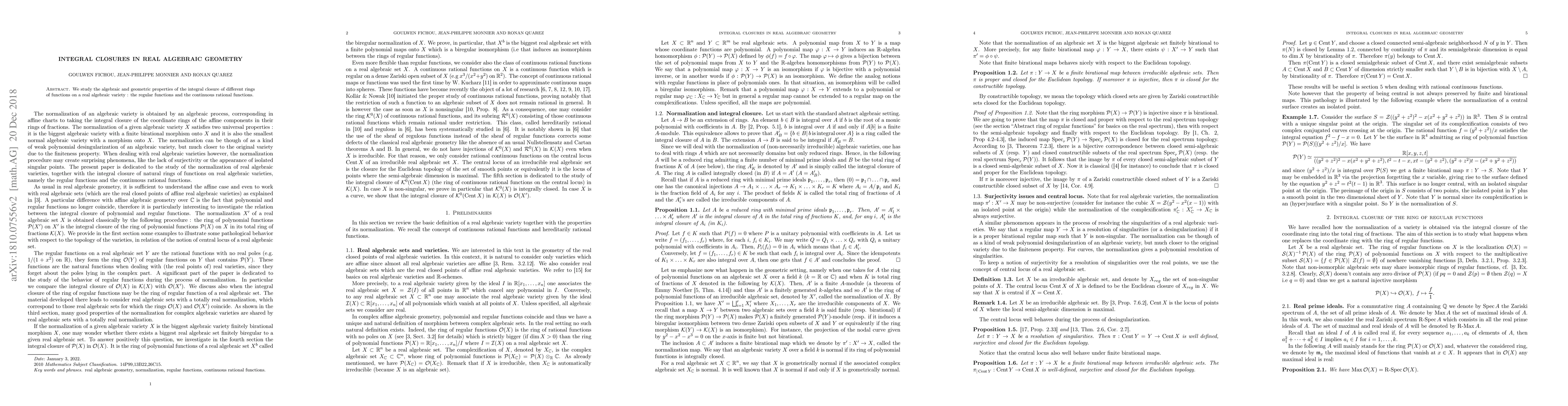 The paper introduces and proves several technical lemmas and propositions concerning integral closures, minimal prime ideals, and the properties of rings of regular and continuous functions on real algebraic varieties.