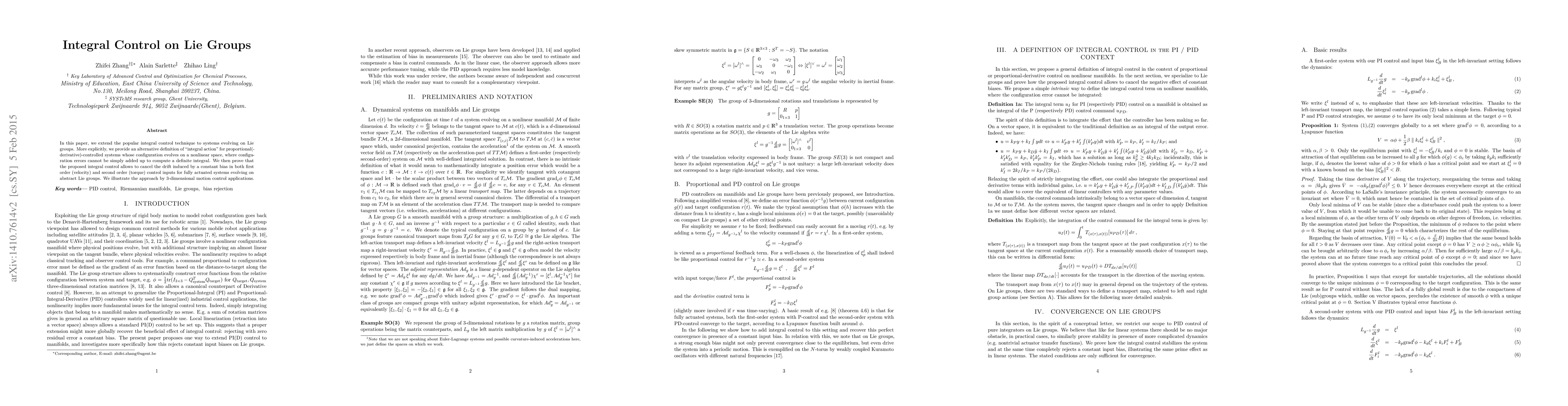 This paper proposes an integral control technique for systems on Lie groups, providing an alternative "integral action" definition to manage configuration errors. The method cancels drift from constant bias in both velocity and torque inputs, demonstrated through 3D motion control applications.