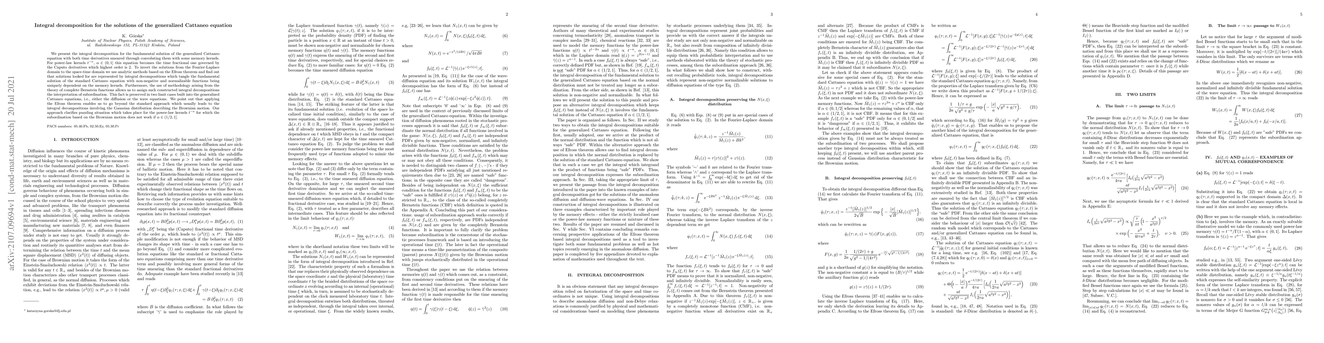 This paper presents an integral decomposition for the fundamental solution of the generalized Cattaneo equation, which incorporates memory kernels for time derivatives. The methodology reveals that solutions can be represented by unique integral decompositions dependent on the memory kernels, extending beyond the Gaussian distribution typically used for Brownian motion.