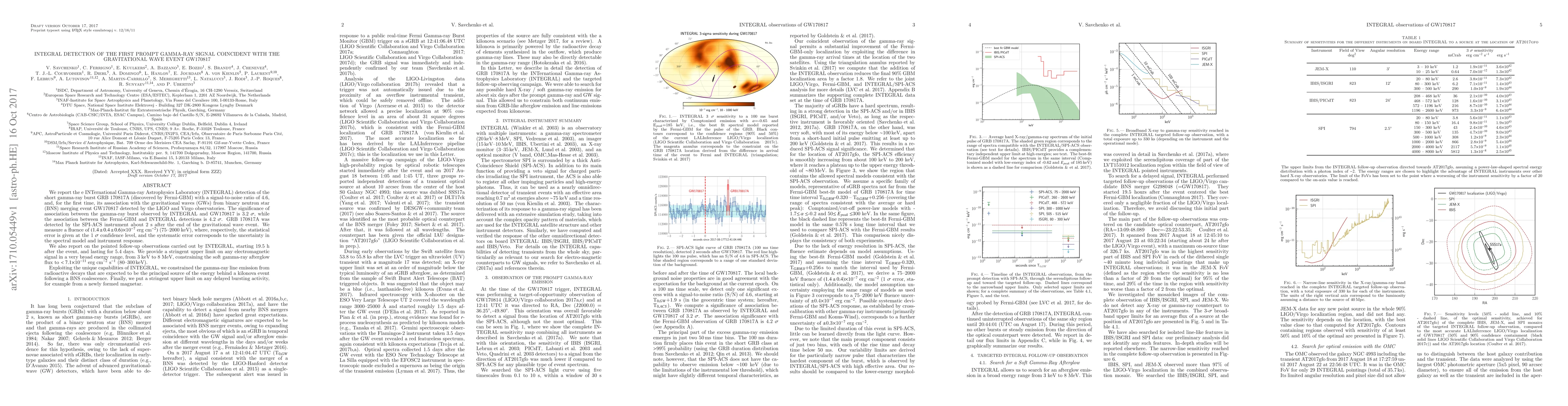 We report the e INTernational Gamma-ray Astrophysics Laboratory (INTEGRAL) detection of the short gamma-ray burst GRB 170817A (discovered by Fermi-GBM) with a signal-to-noise ratio of 4.6, and, for the first time, its association with the gravitational waves (GWs) from binary neutron star (BNS) merging event GW170817 detected by the LIGO and Virgo observatories. The significance of association between the gamma-ray burst observed by INTEGRAL and GW170817 is 3.2 $\sigma$, while the association between the Fermi-GBM and INTEGRAL detections is 4.2 $\sigma$. GRB 170817A was detected by the SPI-ACS instrument about 2 s after the end of the gravitational wave event. We measure a fluence of $(1.4 \pm 0.4 \pm 0.6) \times$10$^{-7}$ erg cm$^{-2})$ (75--2000 keV), where, respectively, the statistical error is given at the 1 $\sigma$ confidence level, and the systematic error corresponds to the uncertainty in the spectral model and instrument response. We also report on the pointed follow-up observations carried out by INTEGRAL, starting 19.5 h after the event, and lasting for 5.4 days. We provide a stringent upper limit on any electromagnetic signal in a very broad energy range, from 3 keV to 8 MeV, constraining the soft gamma-ray afterglow flux to $<7.1\times$10$^{-11}$ erg cm$^{-2}$ s$^{-1}$ (80--300 keV). Exploiting the unique capabilities of INTEGRAL, we constrained the gamma-ray line emission from radioactive decays that are expected to be the principal source of the energy behind a kilonova event following a BNS coalescence. Finally, we put a stringent upper limit on any delayed bursting activity, for example from a newly formed magnetar.