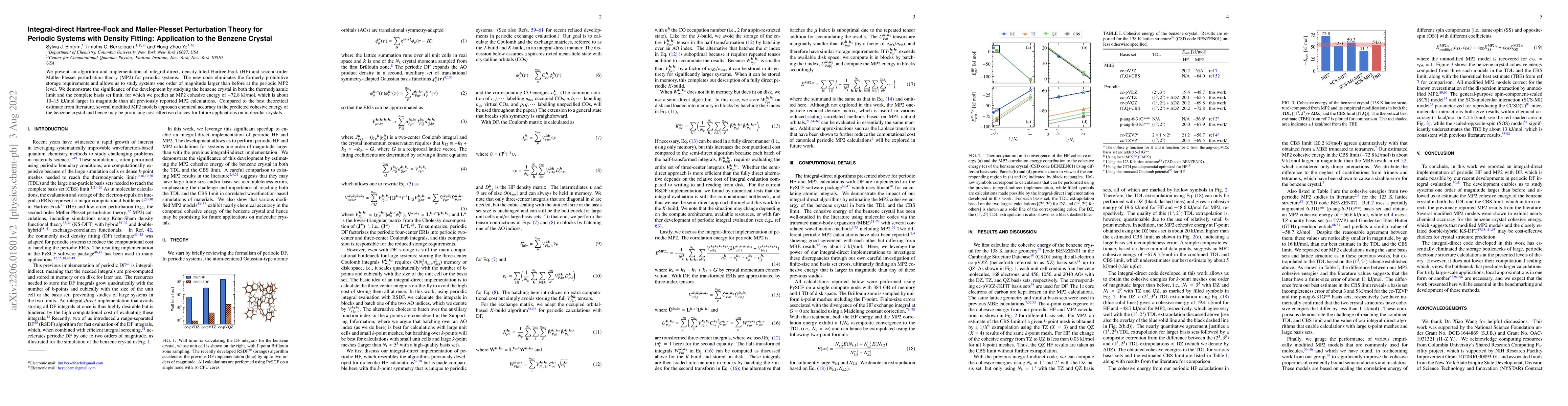 This paper introduces an efficient algorithm for integral-direct, density-fitted Hartree-Fock and MP2 calculations for periodic systems, significantly reducing computational storage needs. The method is demonstrated on benzene crystal, predicting an MP2 cohesive energy of -72.8 kJ/mol, showing potential for future cost-effective studies of molecular crystals.