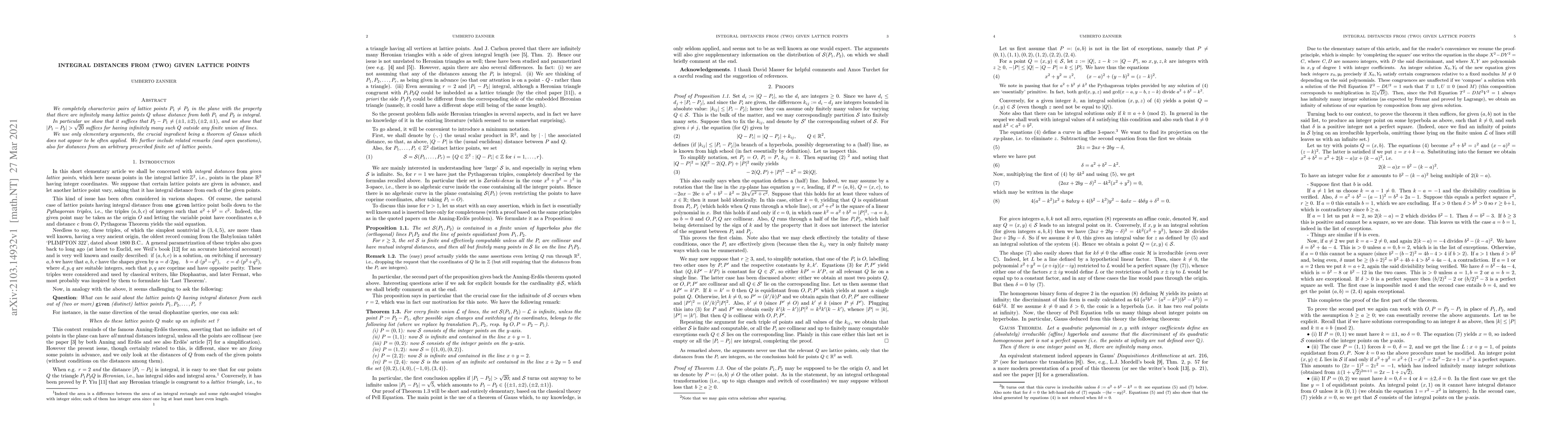 {\it .}We completely characterize pairs of lattice points $P_1\neq P_2$ in the plane with the property that there are infinitely many lattice points $Q$ whose distance from both $P_1$ and $P_2$ is integral. In particular we show that it suffices that $P_2-P_1\neq (\pm 1,\pm 2), (\pm 2,\pm 1)$, and we show that $|P_1-P_2|>\sqrt{20}$ suffices for having infinitely many such $Q$ outside any finite union of lines. We use only elementary arguments, the crucial ingredient being a theorem of Gauss which does not appear to be often applied. We further include related remarks (and open questions), also for distances from an arbitrary prescribed finite set of lattice points % $P_1,\ldots ,P_r$. }