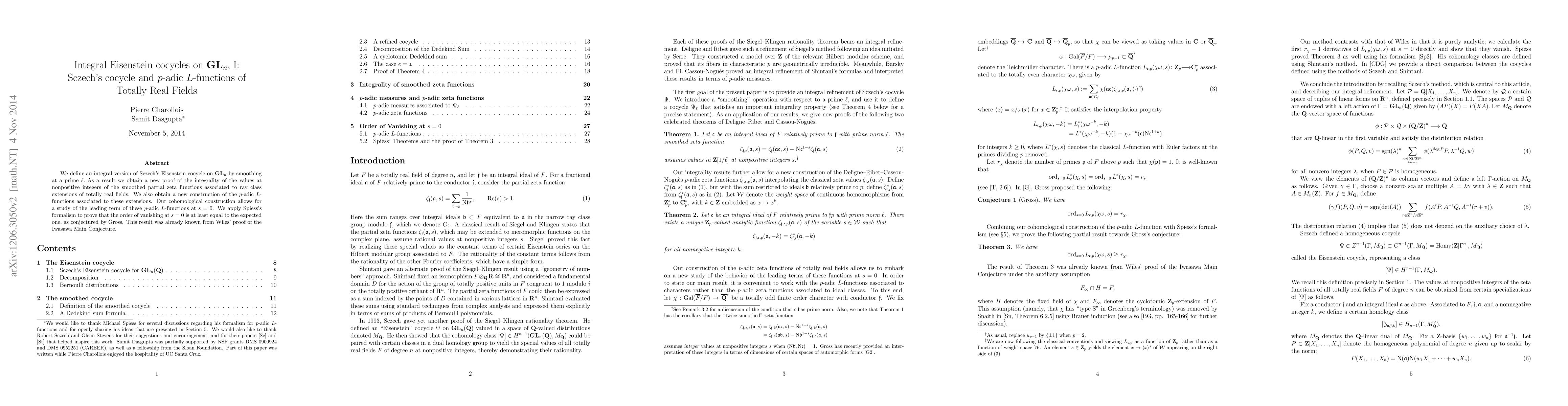 We define an integral version of Sczech's Eisenstein cocycle on GLn by smoothing at a prime ell. As a result we obtain a new proof of the integrality of the values at nonpositive integers of the smoothed partial zeta functions associated to ray class extensions of totally real fields. We also obtain a new construction of the p-adic L-functions associated to these extensions. Our cohomological construction allows for a study of the leading term of these p-adic L-functions at s=0. We apply Spiess's formalism to prove that the order of vanishing at s=0 is at least equal to the expected one, as conjectured by Gross. This result was already known from Wiles' proof of the Iwasawa Main Conjecture.