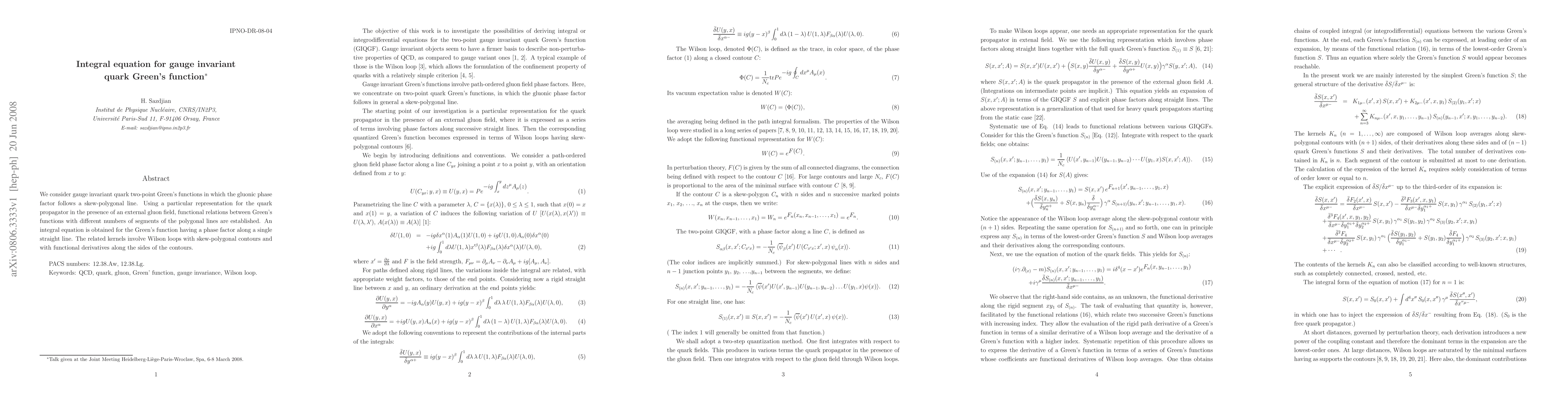 This paper develops an integral equation for gauge invariant quark Green's functions, focusing on the gluonic phase factor along skew-polygonal lines. It establishes functional relations between Green's functions with varying polygonal line segments and introduces kernels involving Wilson loops and functional derivatives.