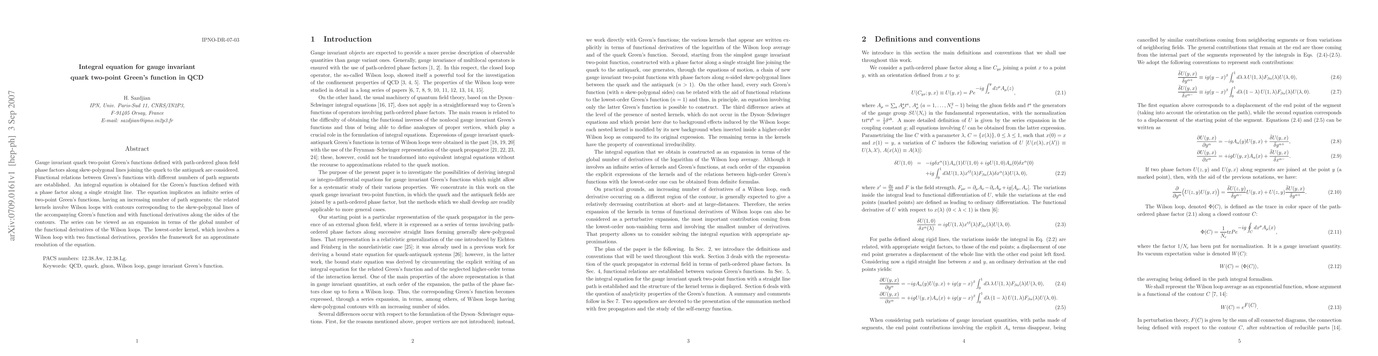 This paper derives an integral equation for gauge invariant quark two-point Green's functions in QCD, involving phase factors along skew-polygonal lines. The equation represents an infinite series of Green's functions, with kernels involving Wilson loops and functional derivatives, and provides a framework for approximate resolution.