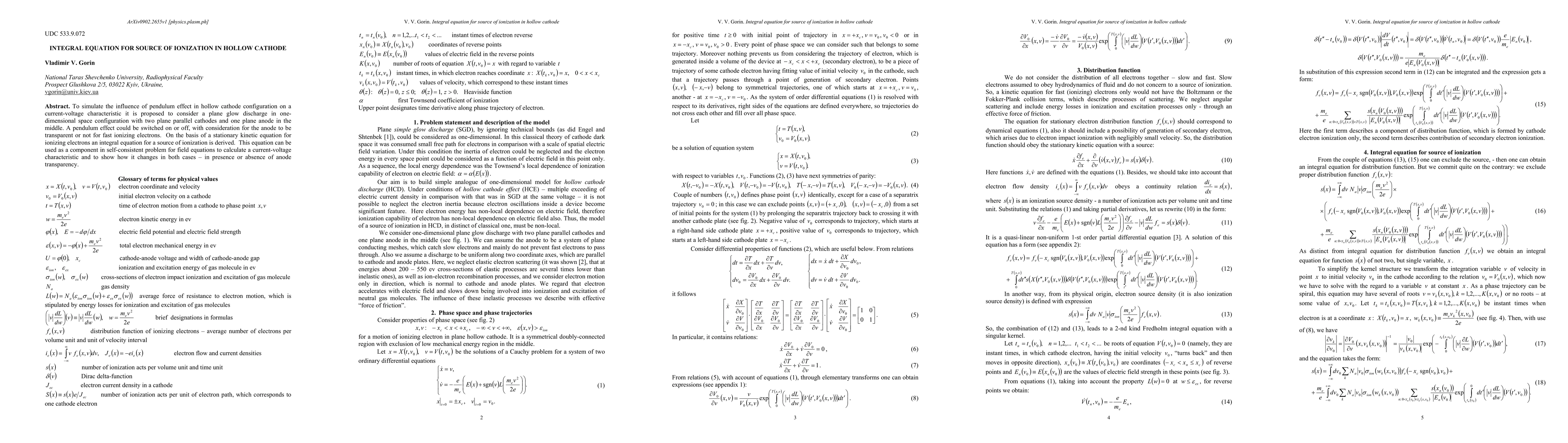 This paper proposes an integral equation for the source of ionization in a hollow cathode, considering a pendulum effect in a one-dimensional plane glow discharge. The derived equation is used to analyze current-voltage characteristics, showing changes with and without transparent anode for fast ionizing electrons.