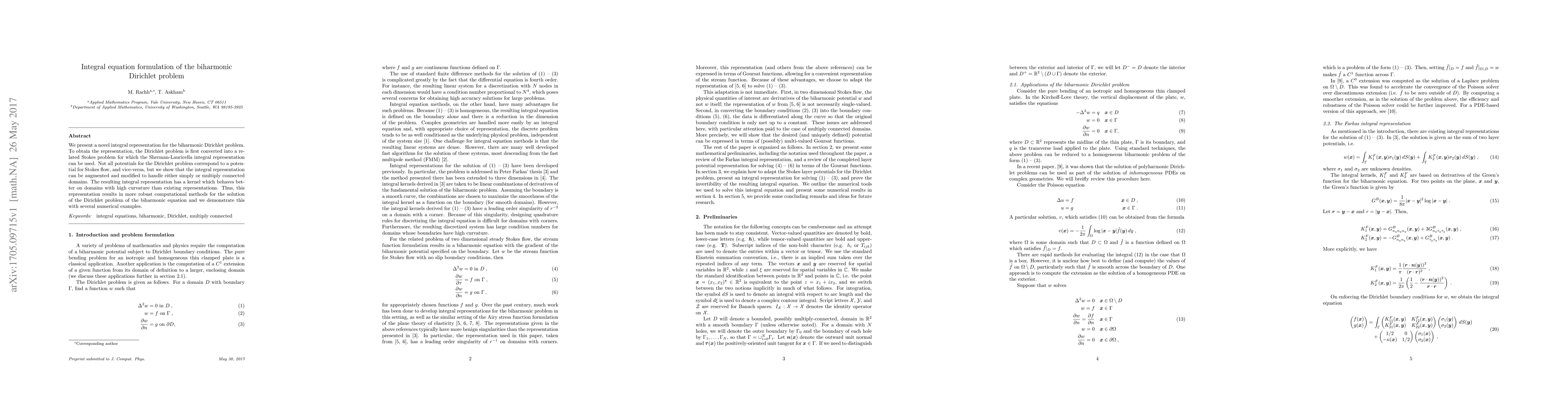 This paper introduces a novel integral representation for solving the biharmonic Dirichlet problem by converting it into a related Stokes problem, utilizing the Sherman-Lauricella integral. The method is robust for both simply and multiply connected domains, especially on those with high curvature, leading to improved computational methods for solving the biharmonic equation.
