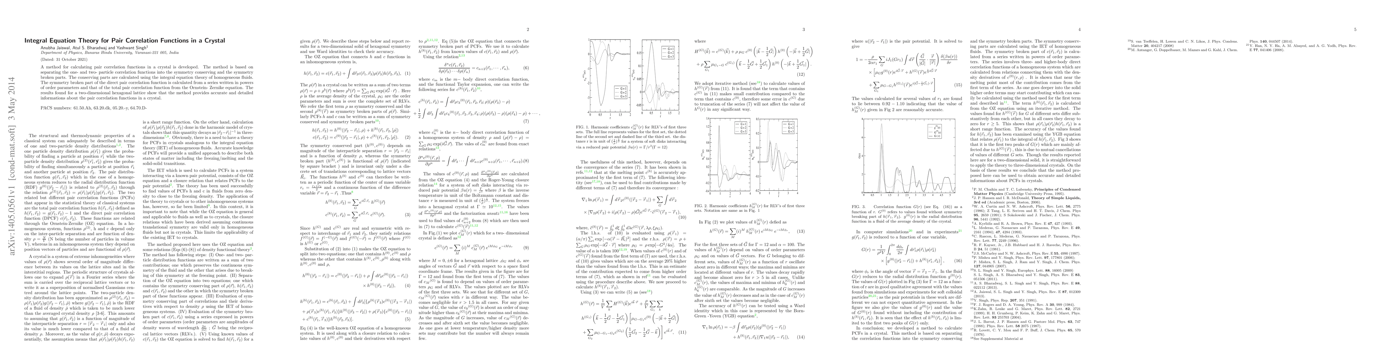 This paper develops a method for calculating pair correlation functions in crystals by separating them into symmetry conserving and broken parts. The conserving parts use integral equation theory, while the broken parts are derived from series and the Ornstein-Zernike equation, yielding accurate insights for a two-dimensional hexagonal lattice.