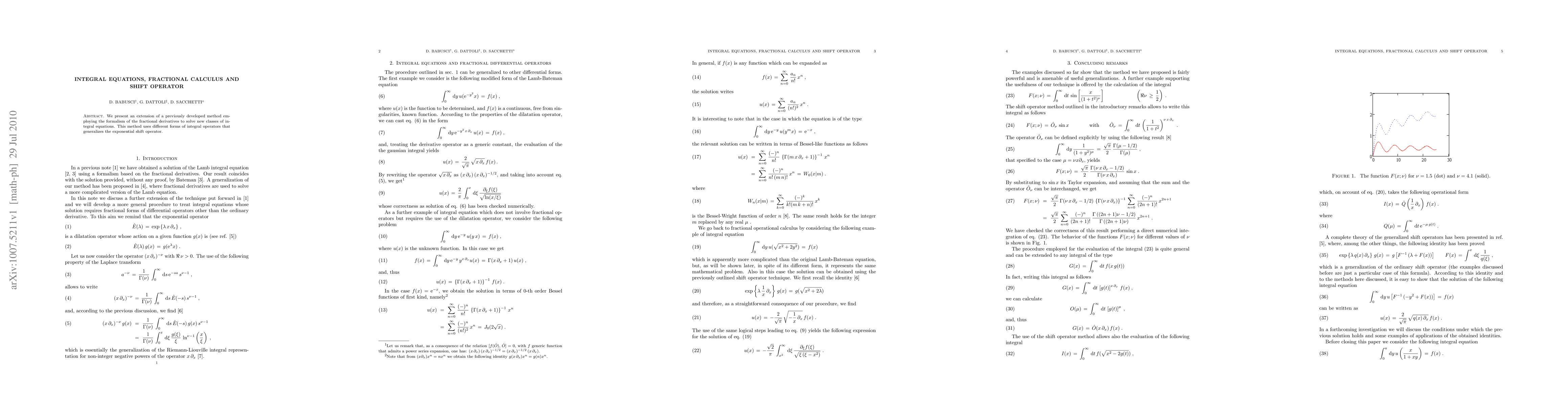 We present an extension of a previously developed method employing the formalism of the fractional derivatives to solve new classes of integral equations. This method uses different forms of integral operators that generalizes the exponential shift operator.
