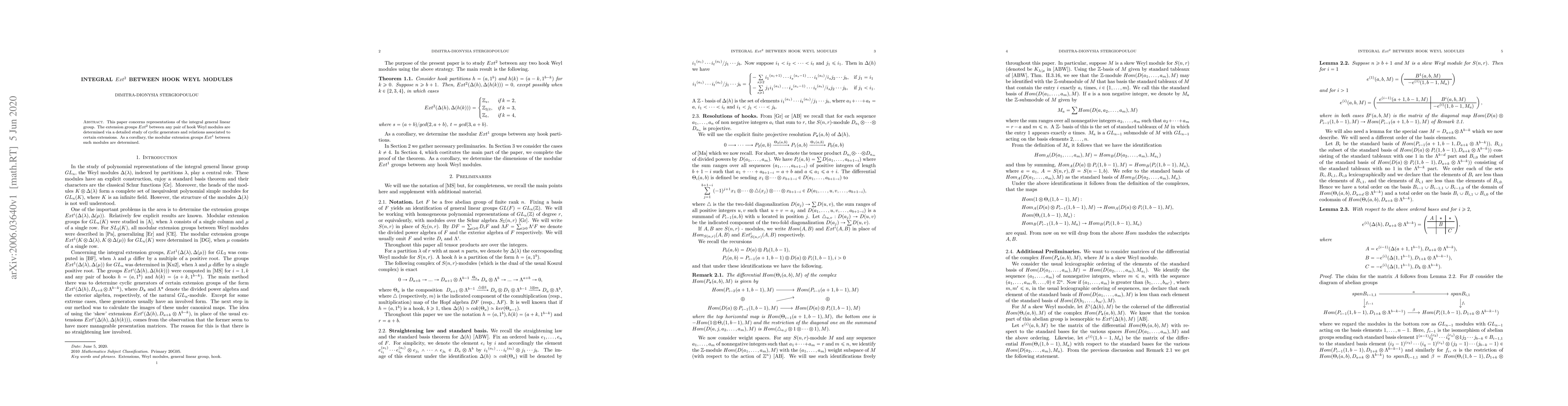 This paper concerns representations of the integral general linear group. The extension groups $Ext^2$ between any pair of hook Weyl modules are determined via a detailed study of cyclic generators and relations associated to certain extensions. As a corollary, the modular extension groups $Ext^1$ between such modules are determined.