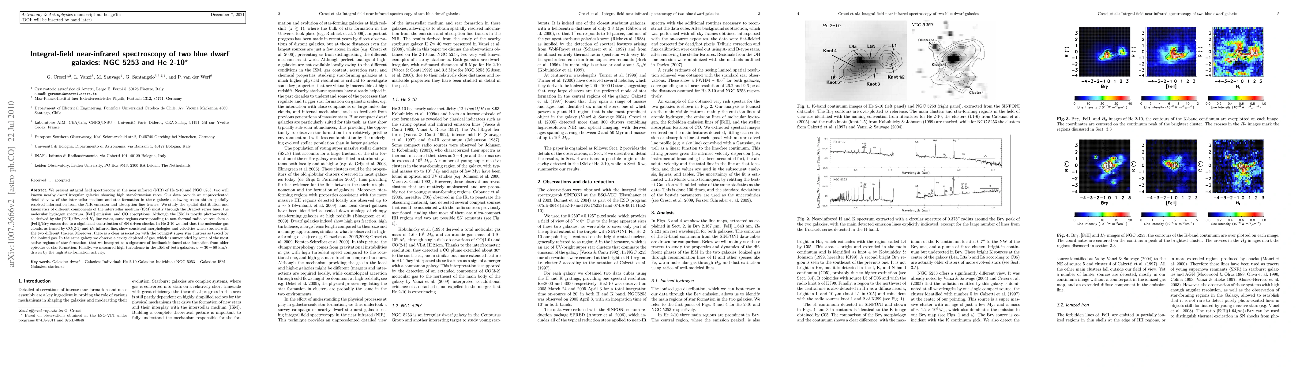 We present integral field spectroscopy in the near infrared (NIR) of He 2-10 and NGC 5253, two well known nearby dwarf irregular galaxies showing high star-formation rates. Our data provide an unprecedented detailed view of the interstellar medium and star formation in these galaxies, allowing us to obtain spatially resolved information from the NIR emission and absorption line tracers. We study the spatial distribution and kinematics of different components of the interstellar medium (ISM) mostly through the Bracket series lines, the molecular hydrogen spectrum, [FeII] emission, and CO absorptions. Although the ISM is mostly photo-excited, as derived by the [FeII]/Bry and H2 line ratios, some regions corresponding to non-thermal radio sources show a [FeII]/Bry excess due to a significant contribution of SN driven shocks. In He 2-10 we find that the molecular gas clouds, as traced by CO(2-1) and H2 infrared line, show consistent morphologies and velocities when studied with the two different tracers. Moreover, there is a clear association with the youngest super star clusters as traced by the ionized gas. In the same galaxy we observe a cavity depleted of gas, which is surrounded by some of the most active regions of star formation, that we interpret as a signature of feedback-induced star formation from older episodes of star formation. Finally, we measured high turbulence in the ISM of both galaxies, sigma~30-80 km/s, driven by the high star-formation activity.