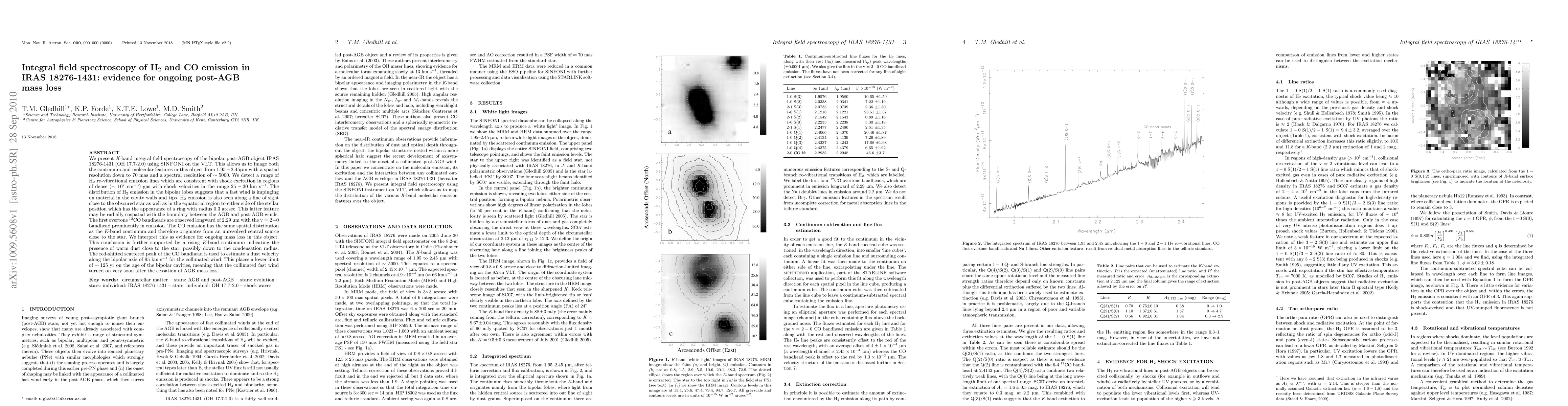 We present K-band integral field spectroscopy of the bipolar post-AGB object IRAS 18276-1431 (OH 17.7-2.0) using SINFONI on the VLT. This allows us to image both the continuum and molecular features in this object from 1.95-2.45{\mu}m with a spatial resolution down to 70 mas and a spectral resolution of approx. 5000. We detect a range of H2 ro-vibrational emission lines which are consistent with shock excitation in regions of dense (approx. 10^7 cm^-3) gas with shock velocities in the range 25 - 30 km/s. The distribution of H2 emission in the bipolar lobes suggests that a fast wind is impinging on material in the cavity walls and tips. H2 emission is also seen along a line of sight close to the obscured star as well as in the equatorial region to either side of the stellar position which has the appearance of a ring with radius 0.3 arcsec. This latter feature may be radially cospatial with the boundary between the AGB and post-AGB winds. The first overtone 12^CO bandheads are observed longward of 2.29 {\mu}m with the v = 2-0 bandhead prominently in emission. The CO emission has the same spatial distribution as the K-band continuum and therefore originates from an unresolved central source close to the star. We interpret this as evidence for ongoing mass loss in this object. This conclusion is further supported by a rising K-band continuum indicating the presence of warm dust close to the star, possibly down to the condensation radius. The red-shifted scattered peak of the CO bandhead is used to estimate a dust velocity along the bipolar axis of 95 km/s for the collimated wind. This places a lower limit of approx. 125 yr on the age of the bipolar cavities, meaning that the collimated fast wind turned on very soon after the cessation of AGB mass loss.