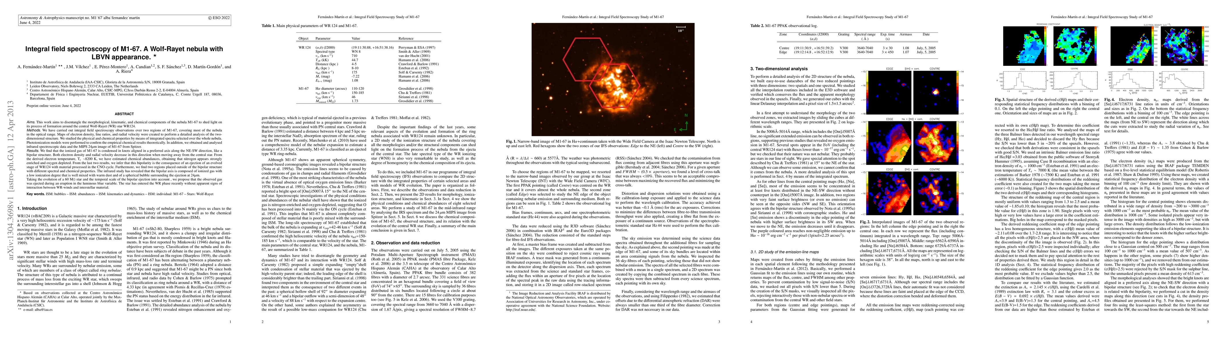 This study uses integral field spectroscopy to analyze the nebula M1-67, revealing a bipolar structure aligned NE-SW around the central Wolf-Rayet star WR124. The findings suggest that the nebula's ionized gas and radial velocity decrease along this axis, indicating an ejection event during the star's luminous blue variable phase, leading to nitrogen enrichment and oxygen depletion.