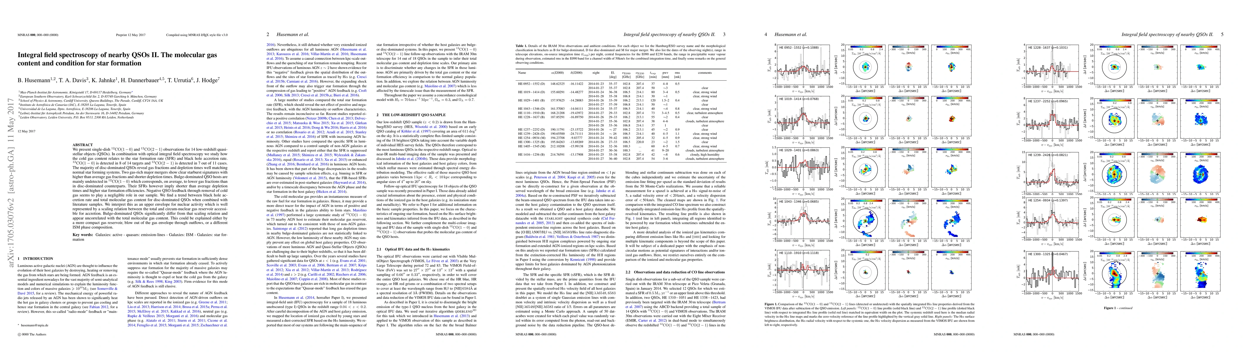 This study uses CO observations and optical spectroscopy to investigate the molecular gas content and star formation conditions in 14 low-redshift QSOs. It finds that gas-rich disc-dominated QSOs resemble normal star-forming systems, while bulge-dominated QSOs show lower gas fractions but higher star formation efficiencies, suggesting different gas dynamics and accretion mechanisms.
