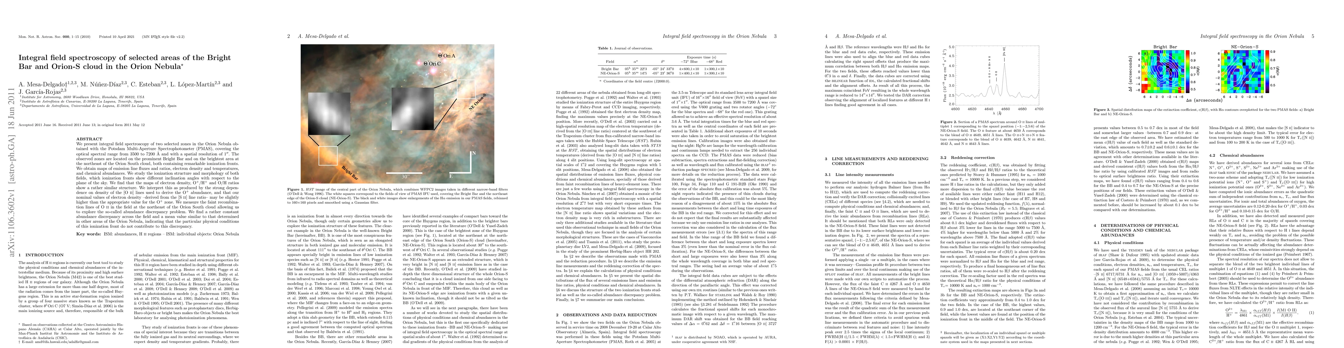 This study uses integral field spectroscopy to analyze two regions in the Orion Nebula, focusing on the Bright Bar and the Orion-S cloud. The research reveals similar structures in electron density and chemical abundances, while addressing the abundance discrepancy problem, finding consistent results across the observed areas.