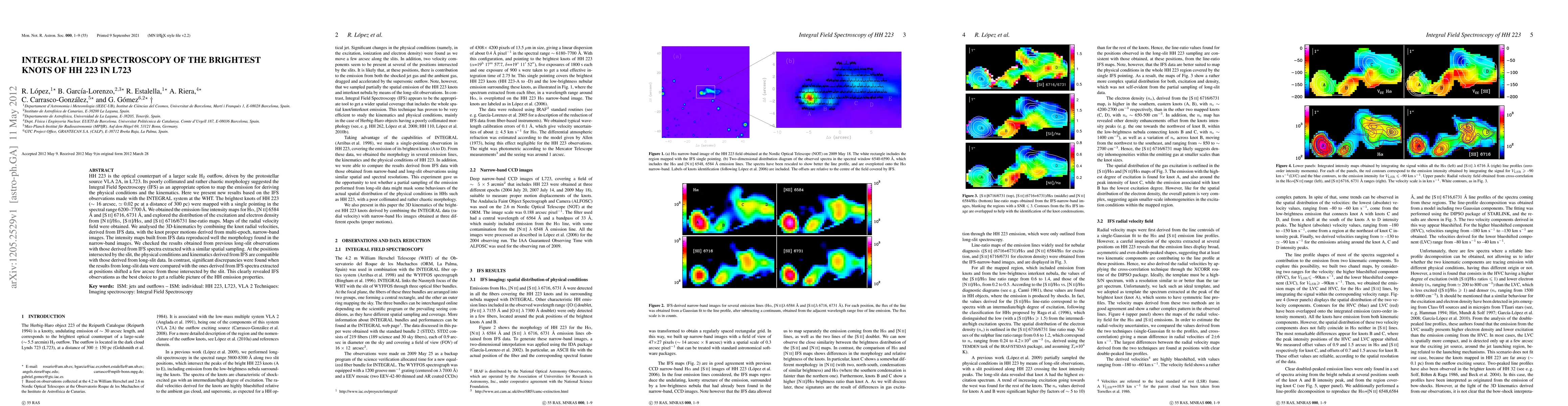 HH 223 is the optical counterpart of a larger scale H2 outflow, driven by the protostellar source VLA 2A, in L723. Its poorly collimated and rather chaotic morphology suggested the Integral Field Spectroscopy (IFS) as an appropriate option to map the emission for deriving the physical conditions and the kinematics. Here we present new results based on the IFS observations made with the INTEGRAL system at the WHT. The brightest knots of HH 223 (\sim16 arcsec, 0.02 pc at a distance of 300 pc) were mapped with a single pointing in the spectral range 6200-7700 A. We obtained the emission-line intensity maps for Halpha, [NII] 6584 A and [SII] 6716, 6731 A, and explored the distribution of the excitation and electron density from [NII]/Halpha, [SII]/Halpha, and [SII] 6716/6731 line-ratio maps. Maps of the radial velocity field were obtained. We analysed the 3D-kinematics by combining the knot radial velocities, derived from IFS data, with the knot proper motions derived from multi-epoch, narrow-band images. The intensity maps built from IFS data reproduced well the morphology found in the narrow-band images. We checked the results obtained from previous long-slit observations with those derived from IFS spectra extracted with a similar spatial sampling. At the positions intersected by the slit, the physical conditions and kinematics derived from IFS are compatible with those derived from long-slit data. In contrast, significant discrepancies were found when the results from long-slit data were compared with the ones derived from IFS spectra extracted at positions shifted a few arcsec from those intersected by the slit. This clearly revealed IFS observations as the best choice to get a reliable picture of the HH emission properties.