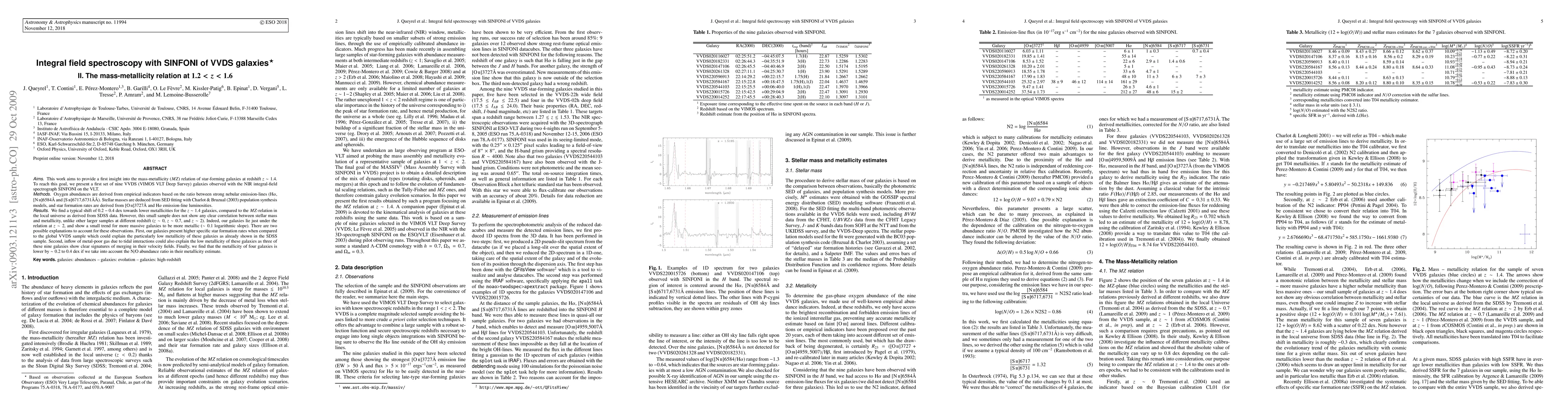 This work aims to provide a first insight into the mass-metallicity (MZ) relation of star-forming galaxies at redshift z~1.4. To reach this goal, we present a first set of nine VVDS galaxies observed with the NIR integral-field spectrograph SINFONI on the VLT. Oxygen abundances are derived from empirical indicators based on the ratio between strong nebular emission-lines (Halpha, [NII]6584 and [SII]6717,6731). Stellar masses are deduced from SED fitting with Charlot & Bruzual (2007) population synthesis models, and star formation rates are derived from [OII]3727 and Halpha emission-line luminosities. We find a typical shift of 0.2-0.4 dex towards lower metallicities for the z~1.4 galaxies, compared to the MZ-relation in the local universe as derived from SDSS data. However, this small sample of eight galaxies does not show any clear correlation between stellar mass and metallicity, unlike other larger samples at different redshift (z~0, z~0.7, and z~2). Indeed, our galaxies lie just under the relation at z~2 and show a small trend for more massive galaxies to be more metallic (~0.1 logarithmic slope). There are two possible explanations to account for these observations. First, the most massive galaxies present higher specific star formation rates when compared to the global VVDS sample which could explain the particularly low metallicity of these galaxies as already shown in the SDSS sample. Second, inflow of metal-poor gas due to tidal interactions could also explain the low metallicity of these galaxies as two of these three galaxies show clear signatures of merging in their velocity fields. Finally, we find that the metallicity of 4 galaxies is lower by ~0.2 to 0.4 dex if we take into account the N/O abundance ratio in their metallicity estimate.