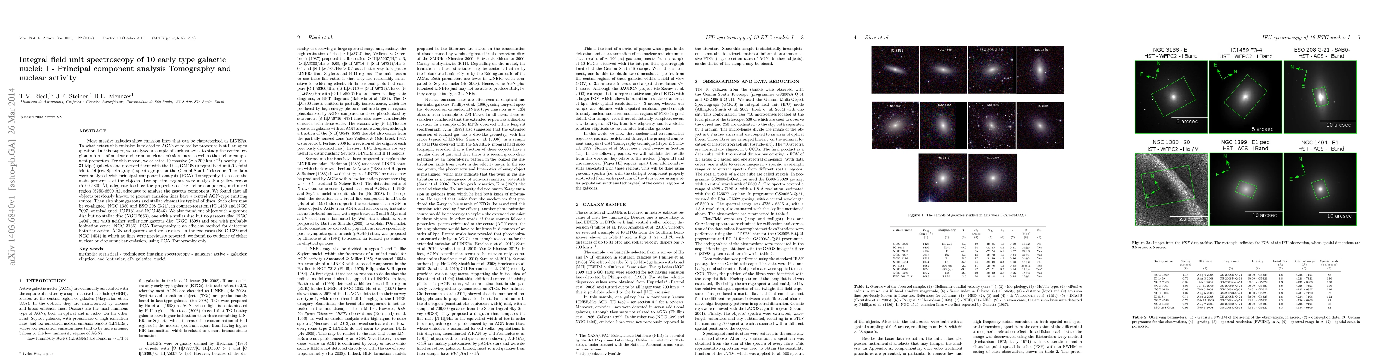 Most massive galaxies show emission lines that can be characterized as LINERs. To what extent this emission is related to AGNs or to stellar processes is still an open question. In this paper, we analysed a sample of such galaxies to study the central region in terms of nuclear and circumnuclear emission lines, as well as the stellar component properties. For this reason, we selected 10 massive ($\sigma$ > 200 km/s) nearby (d < 31 Mpc) galaxies and observed them with the IFU/GMOS (integral field unit/Gemini Multi-Object Spectrograph) spectrograph on the Gemini South Telescope. The data were analysed with principal component analysis (PCA) Tomography to assess the main properties of the objects. Two spectral regions were analysed: a yellow region (5100-5800 A), adequate to show the properties of the stellar component, and a red region (6250-6800 A), adequate to analyse the gaseous component. We found that all objects previously known to present emission lines have a central AGN-type emitting source. They also show gaseous and stellar kinematics typical of discs. Such discs may be co-aligned (NGC 1380 and ESO 208 G-21), in counter-rotation (IC 1459 and NGC 7097) or misaligned (IC 5181 and NGC 4546). We also found one object with a gaseous disc but no stellar disc (NGC 2663), one with a stellar disc but no gaseous disc (NGC 1404), one with neither stellar nor gaseous disc (NGC 1399) and one with probably ionization cones (NGC 3136). PCA Tomography is an efficient method for detecting both the central AGN and gaseous and stellar discs. In the two cases (NGC 1399 and NGC 1404) in which no lines were previously reported, we found no evidence of either nuclear or circumnuclear emission, using PCA Tomography only.