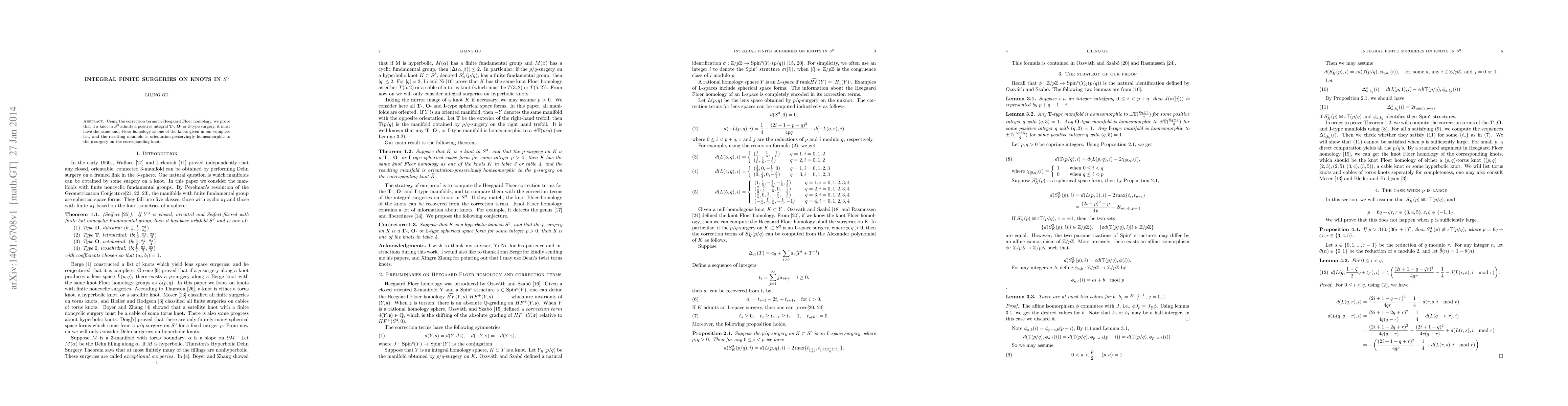 Using the correction terms in Heegaard Floer homology, we prove that if a knot in $S^3$ admits a positive integral $\mathbf{T}$-, $\mathbf{O}$- or $\mathbf{I}$-type surgery, it must have the same knot Floer homology as one of the knots given in our complete list, and the resulting manifold is orientation-preservingly homeomorphic to the $p$-surgery on the corresponding knot.