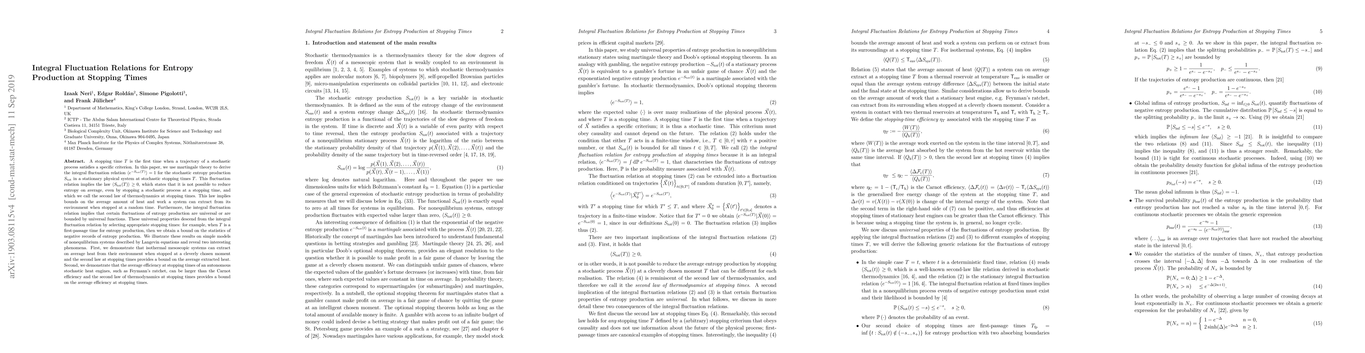 This paper derives an integral fluctuation relation for entropy production at stopping times using martingale theory, establishing that the average entropy production cannot be negative. It also reveals universal properties of entropy fluctuations and demonstrates applications in nonequilibrium systems, showing that systems can extract heat and that heat engine efficiencies can exceed Carnot efficiency under specific stopping conditions.
